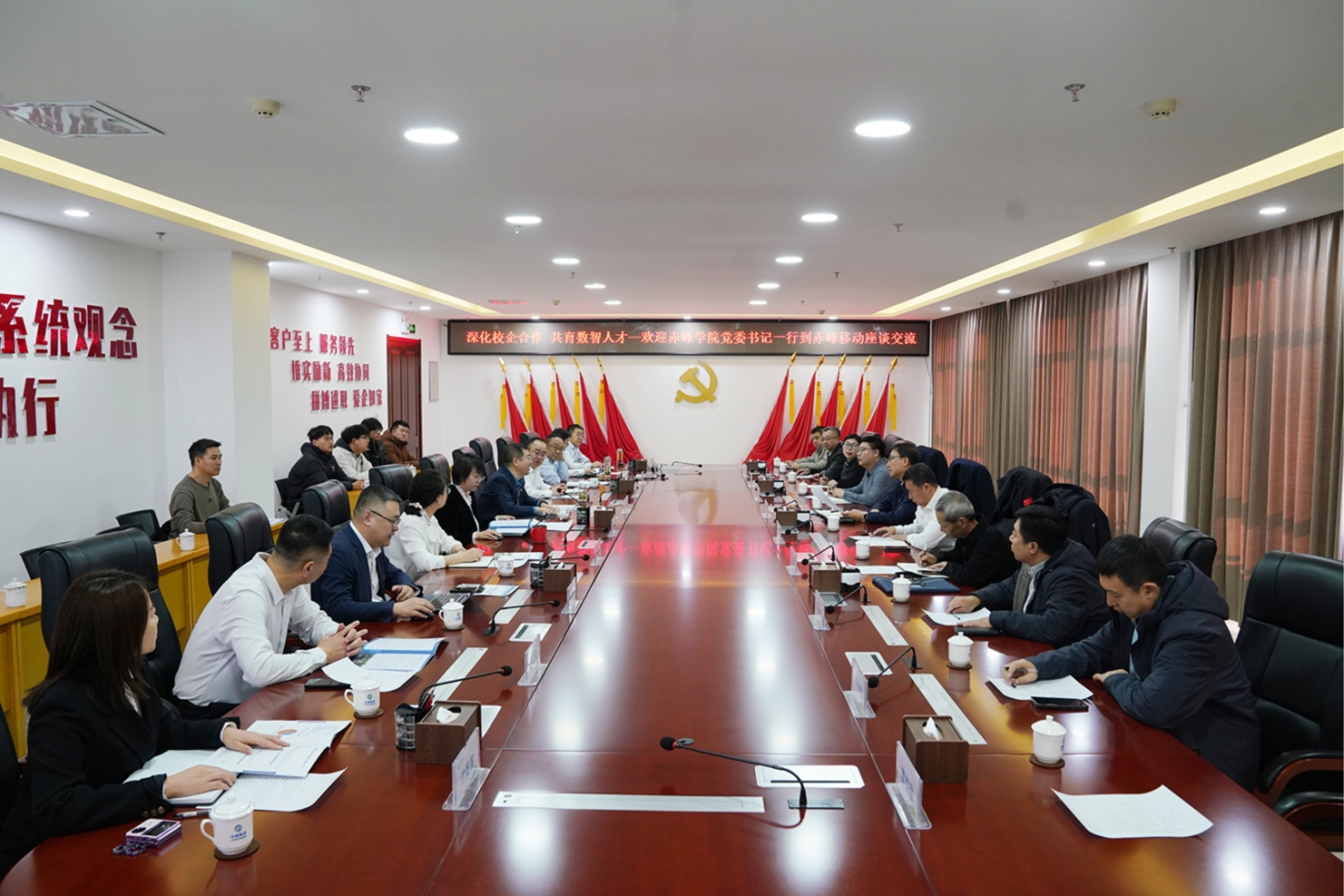 为精准对接企业人才需求,促进毕业生高质量就业,深化校企合作,2月26日,我校党委书记孟和巴特尔率队赴中国移动通信集团内蒙古有限公司赤峰分公司、中移铁通有限公司赤峰市分公司走访交流,以实地考察、座谈交流的形式,搭建校企合作新平台,为2026届毕业生开拓优质就业渠道。党政办公室、就业与校地合作处、网络信息中心、数学与计算机科学学院、物理与智能制造工程学院、文学院、经济与管理学院、体育学院负责人及相关专业毕业生参加活动。中国移动通信集团内蒙古有限公司赤峰分公司党委书记、总经理阎秀山,党委委员、副总经理岑春祥、董晓慧,中移铁通有限公司赤峰市分公司总经理马红军以及两家企业人力资源部、政企客户部、工程建设部主要负责人参加座谈。