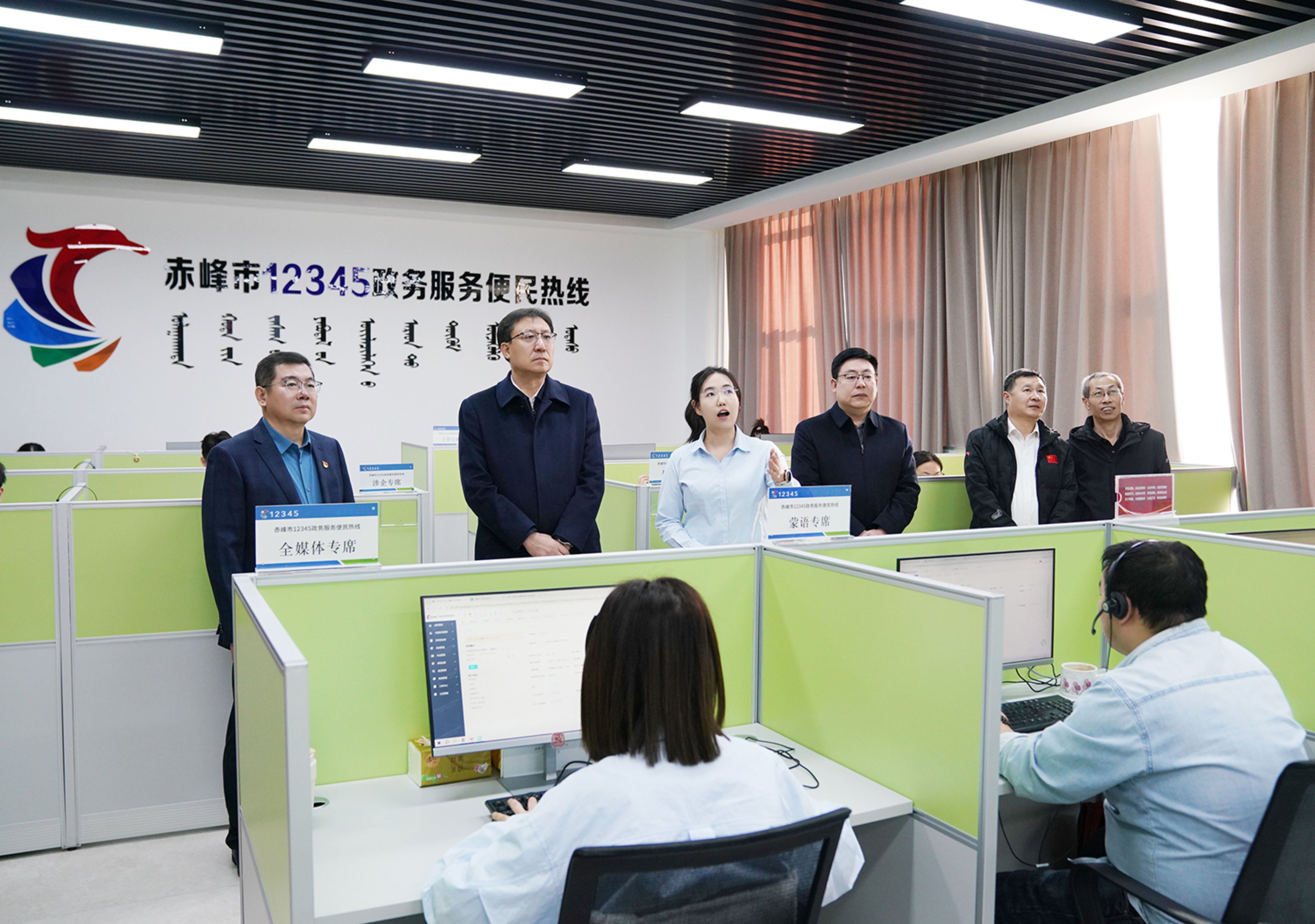 孟和巴特尔书记一行在赤峰移动党委书记、总经理阎秀山和副总经理董晓慧的陪同下,参观了12345政务服务热线中心,实地了解AI技术在政务领域的创新应用情况。