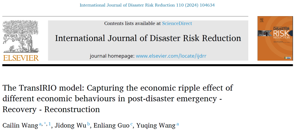近日,王菜林教授为第一作者、我校为第一署名单位,在国际灾害风险顶级期刊《International Journal of Disaster Risk Reduction》(《国际减轻灾害风险杂志》,CiteScore=8.7)发表了题为“The TransIRIO model: Capturing the economic ripple effect of different economic behaviours in post-disaster emergency-Recovery-Reconstruction”(《TransIRIO模型:捕捉灾后应急-恢复-重建差异性经济行为的经济波及影响》)的研究论文。