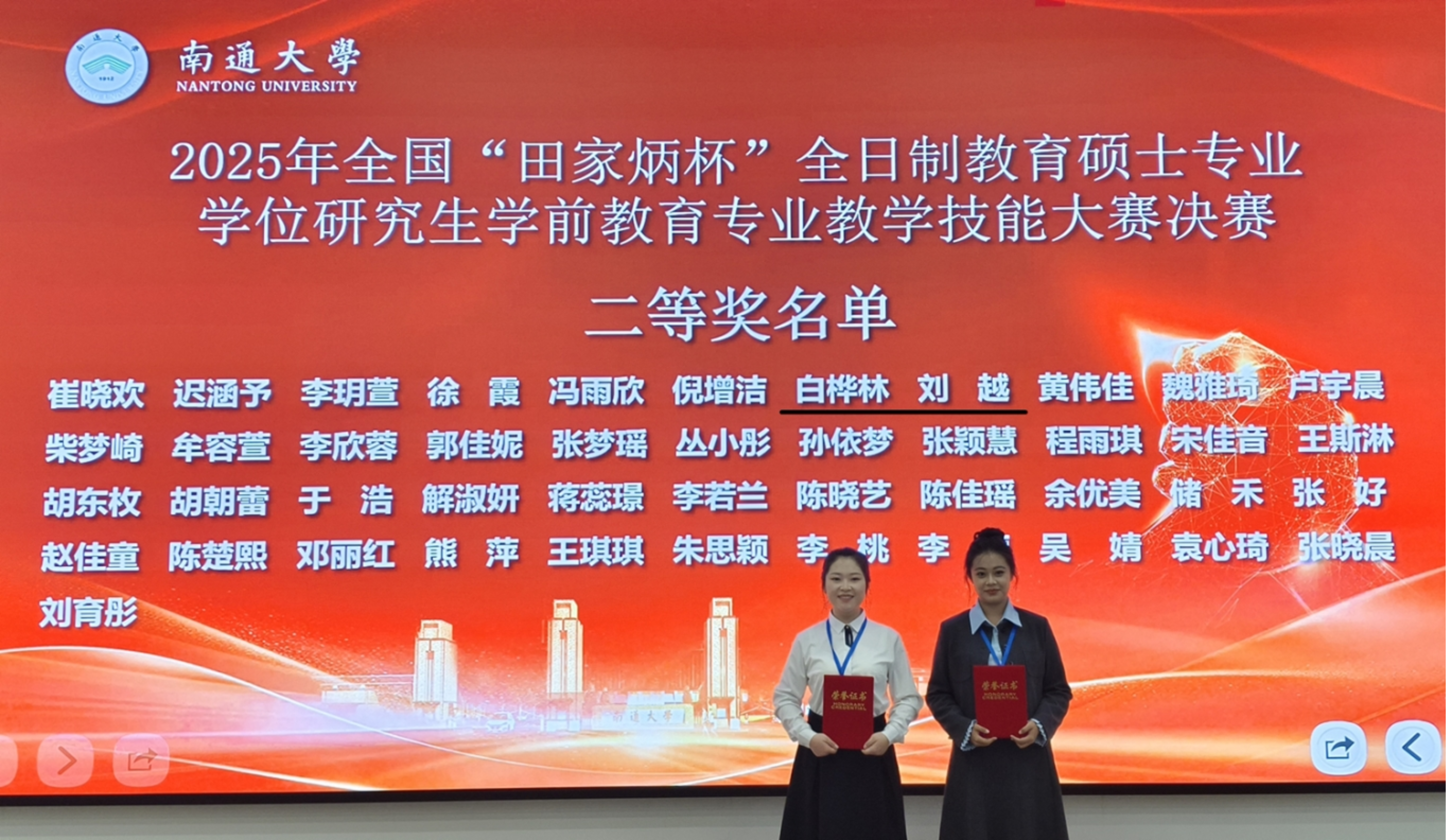 11月2日,2025年全国“田家炳杯”全日制教育硕士专业学位研究生学前教育专业教学技能大赛决赛暨第三届全国学前教育专硕人才培养论坛在江苏省南通大学成功举办,我校教育科学学院2024级学前教育专业学位硕士研究生白桦林(指导教师:付立巍)和刘越(指导教师:张晓艳)同时斩获二等奖。
