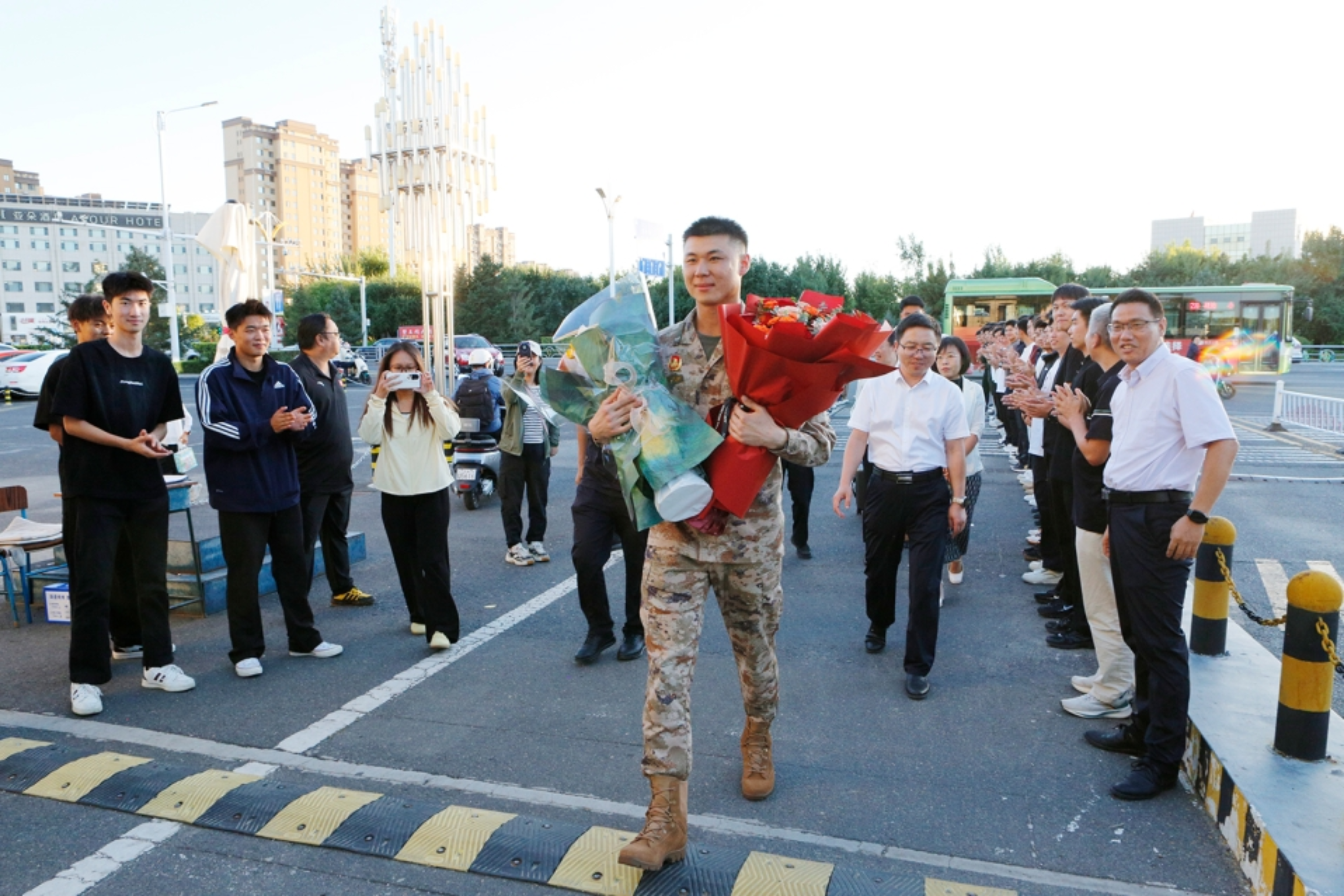 9月7日下午,参加纪念中国人民抗日战争暨世界反法西斯战争胜利80周年阅兵预备役方阵的法学与商务学院刘博睿凯旋归校,孙永刚副校长带领党委宣传部、学生工作处、团委、法学与商务学院负责同志和部分学生代表在学校西门口为刘博睿同学举行了简约且不失隆重的欢迎仪式。随着刘博睿同学精神抖擞的下车,整齐列队的欢迎队伍瞬间掌声雷动,刘博睿向迎接队伍敬礼并报到归校,孙永刚副校长一行为刘博睿同学送上了鲜花,并与学生亲切交流。