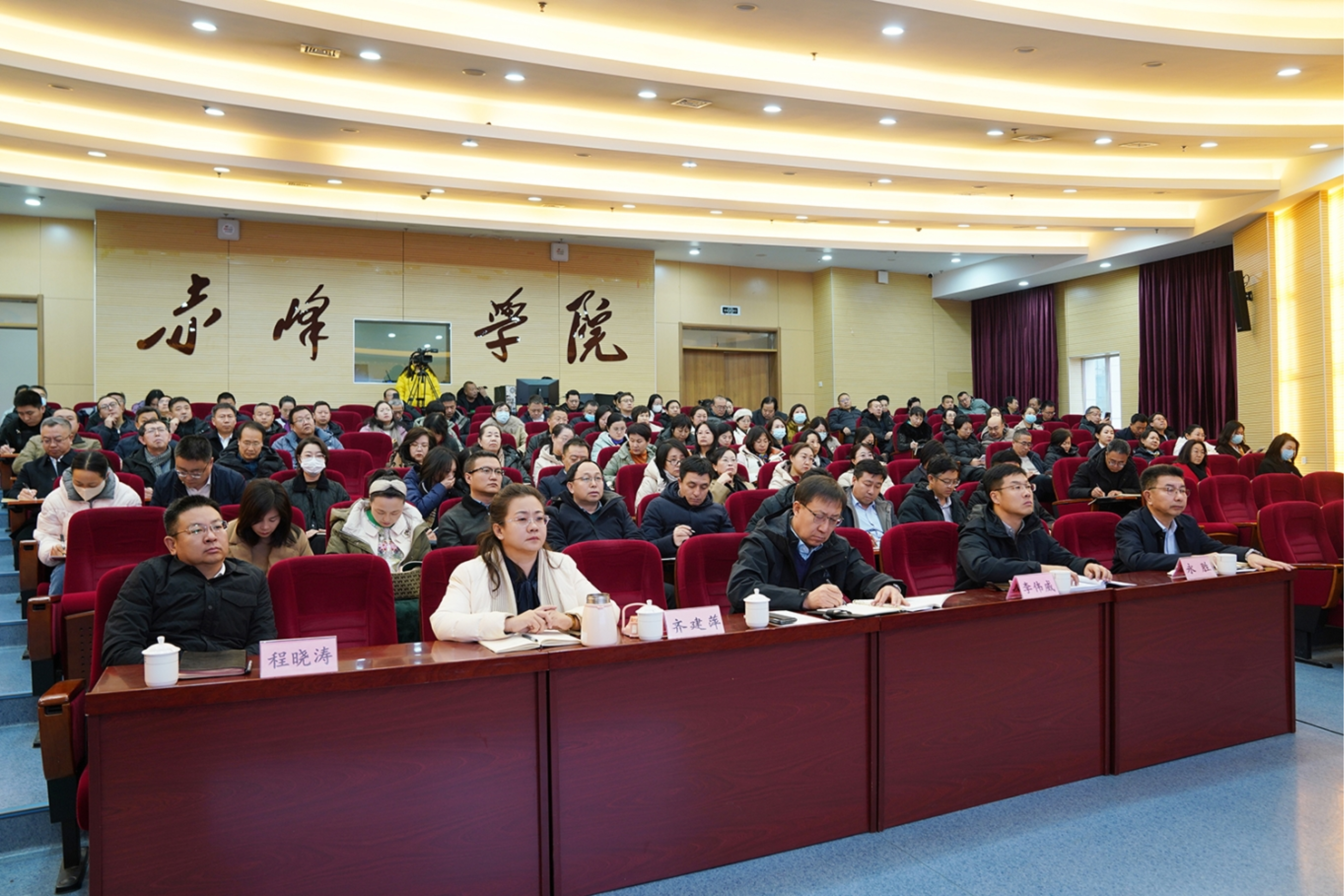 为全面深入学习贯彻党的二十届四中全会精神,切实把全校师生的思想和行动统一到党中央决策部署上来,11月26日下午,我校在博物馆二楼学术报告厅召开全校师生“同上一堂思政课”——深入学习贯彻党的二十届四中全会精神宣讲会。我校党委班子成员、全校处级干部及赤峰学院党的二十届四中全会精神宣讲团成员现场参会,其余师生通过线上平台同步观看学习。宣讲会由校党委委员、党委宣传部部长永胜主持。