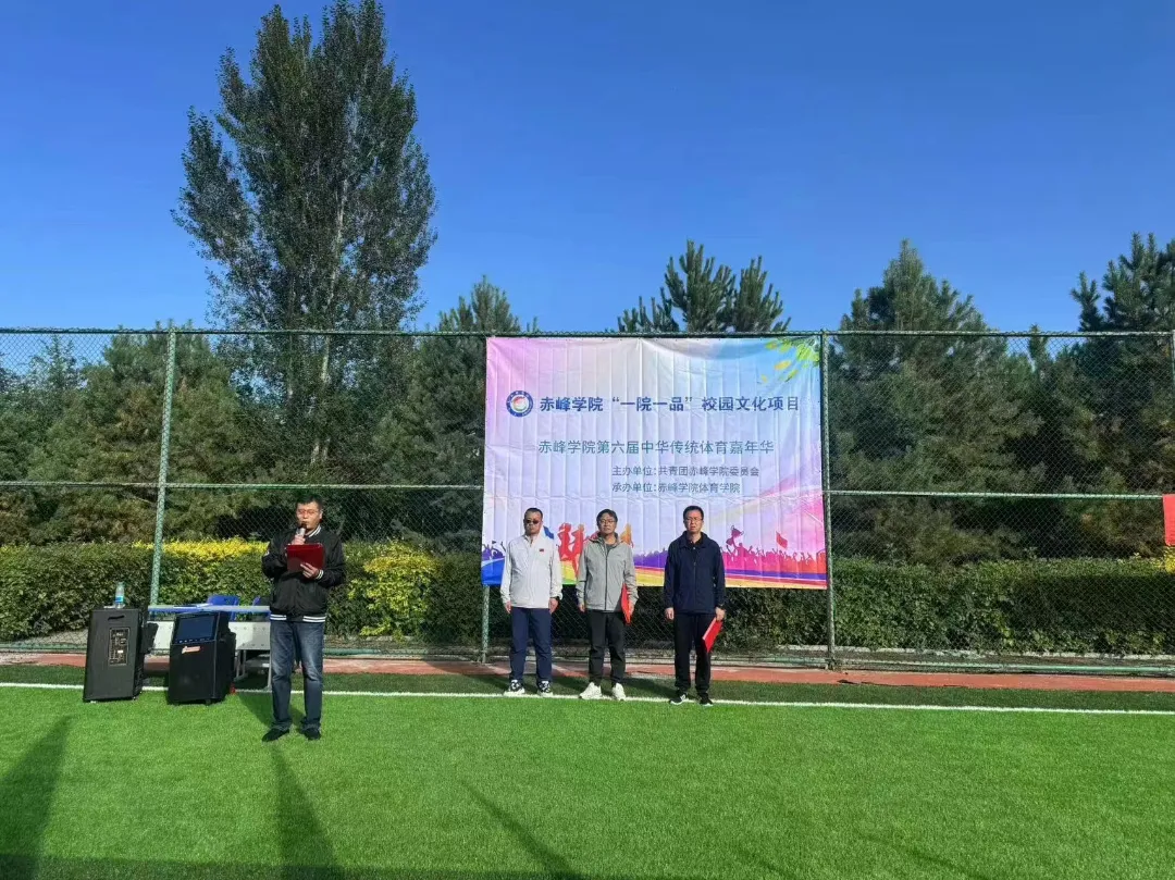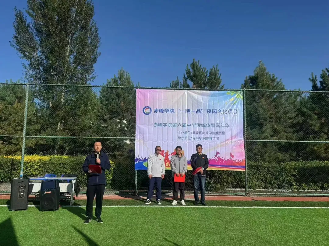 9月21日,赤峰学院五人制足球场迎来了一场别开生面的文化盛宴——赤峰学院第六届中华民族传统体育"嘉年华"。本次活动由校团委主办、体育学院承办,是"一院一品"校园文化活动项目的重要组成部分。校团委书记张明、学生工作处处长孙志永、体育学院党总支副书记黄鑫和体育学院团学办公室负责人米宏伟参加了开幕式。开幕式由体育学院党总支副书记黄鑫主持。