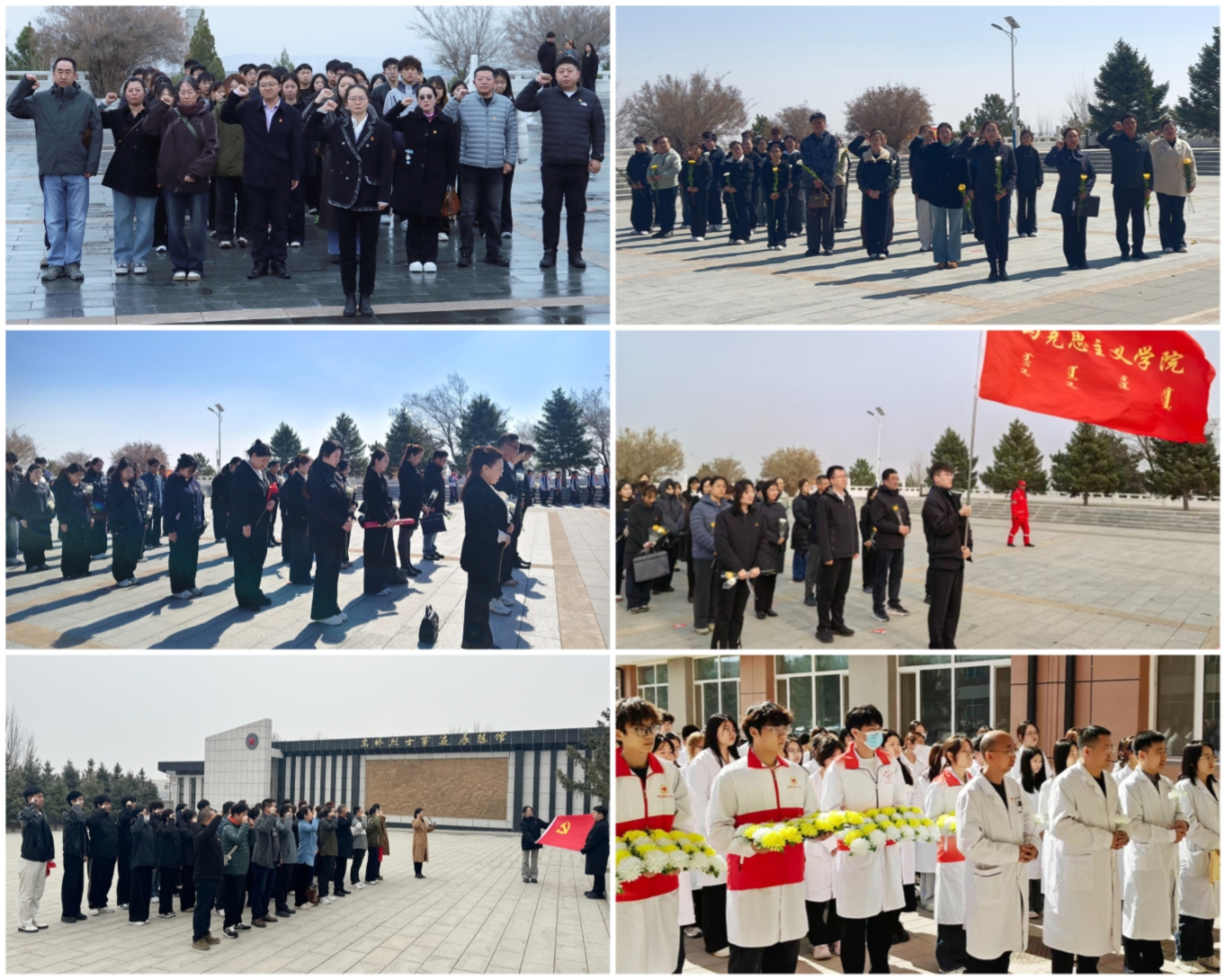 与此同时,校内各单位也同步开展了形式多样的缅怀追思活动,以沉浸式教育厚植家国情怀、赓续精神血脉、坚定使命担当。学生工作处带领2025级班长及学生代表,中医(蒙医)学院组织师生70余人,文学院联合历史文化学院、音乐学院分别赴赤峰南山烈士陵园开展了祭扫活动;马克思主义学院组织师生40余人在赤峰南山烈士陵园,数学与计算机科学学院党总支携手科技处党支部在宁城县高桥烈士陵园开展了主题党日活动,各活动现场通过敬献花篮、肃立默哀、重温入党誓词、瞻仰革命史料、师生代表发言等形式,追思先烈不朽功勋,传承红色革命精神。人体生命科学馆则举办了“清明追思,致敬大体老师”特色活动,60余名师生以默哀献花、观看纪录片的方式,缅怀为医学事业无私奉献的大体老师,培育敬畏生命、秉持仁心的职业初心。