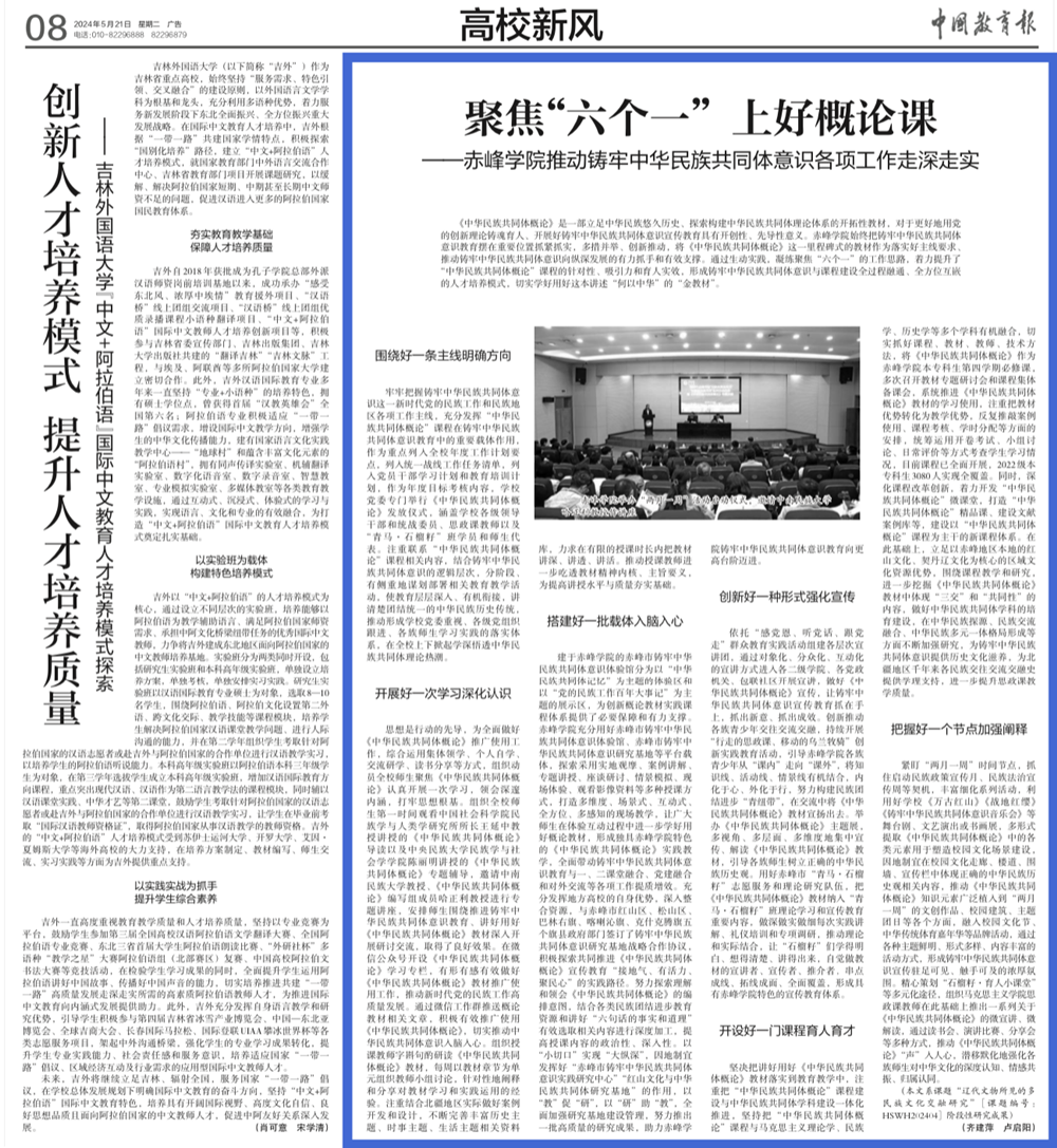5月21日,《中国教育报》第8版“高校新风”以《聚焦“六个一” 上好概论课》为题,对我校推动铸牢中华民族共同体意识各项工作走深走实进行了报道。
