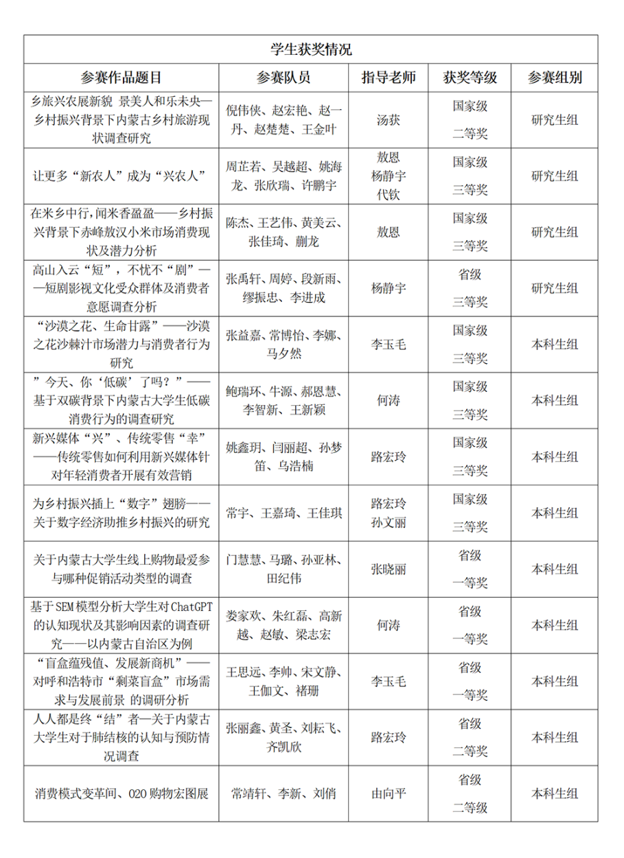 日前,由中国商业统计学会主办的“正大杯”第十四届全国大学生市场调查与分析大赛圆满落幕。我校选送4个研究生团队、9个本科生团队参加相应组别比赛,最终,荣获研究生组国家级二等奖1项、三等奖2项,省级三等奖1项;荣获本科生组国家级三等奖4项,省级一等奖3项、二等奖2项。