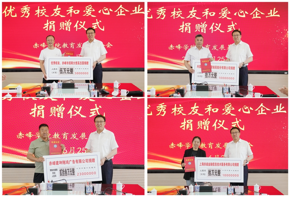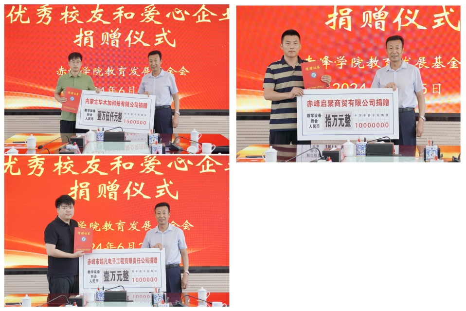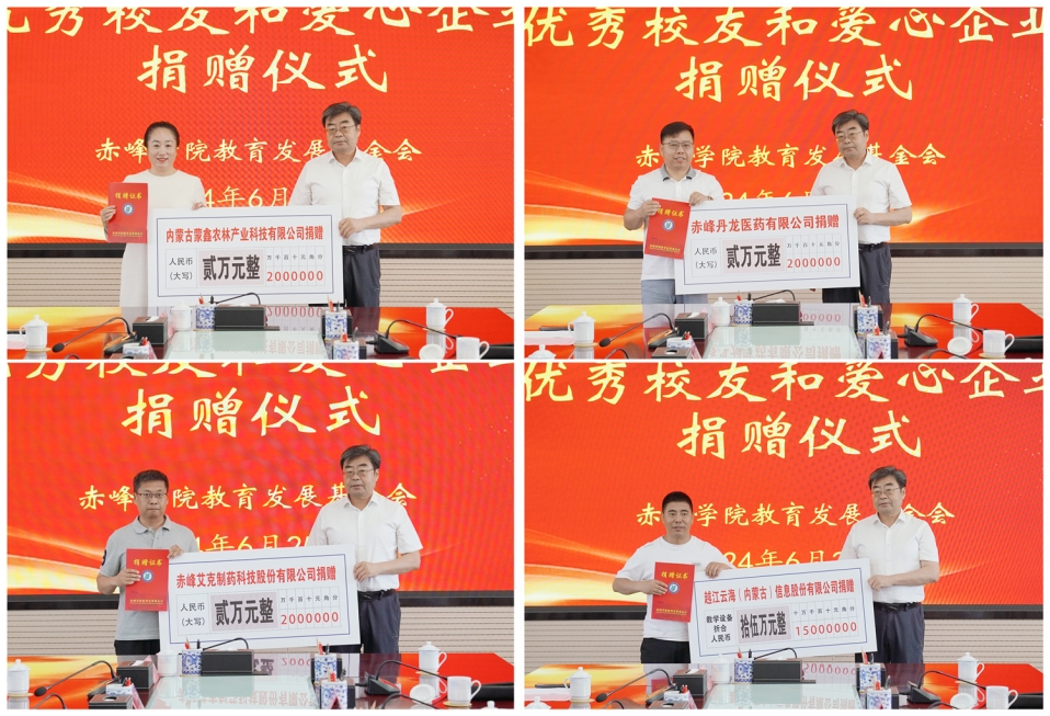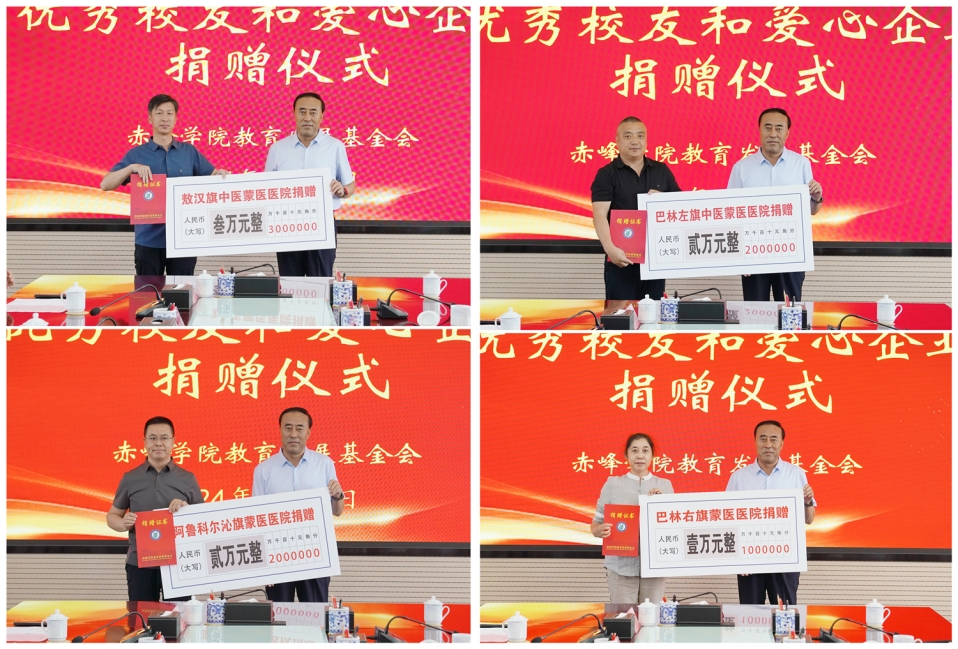 仪式上,优秀校友、赤峰市招商大使高志国,内蒙古天奇蒙药集团,上海扶诚金融信息技术服务有限公司,敖汉旗中医蒙医医院,巴林左旗中医蒙医医院,阿鲁科尔沁旗蒙医医院,巴林右旗蒙医医院,内蒙古蒙鑫农林产业科技有限公司,赤峰丹龙医药有限公司,赤峰艾克制药科技股份有限公司分别为基金会捐赠人民币50000元、100000元、100000元、30000元、20000元、20000元、10000元、20000元、20000元、20000元;赤峰建坤翔鸿广告有限公司、越江云海(内蒙古)信息股份有限公司、内蒙古毕木加科技有限公司、赤峰启聚商贸有限公司、赤峰市超凡电子工程有限责任公司分别为基金会捐赠价值230000元、150000元、100000元、15000元的教育教学设施设备。