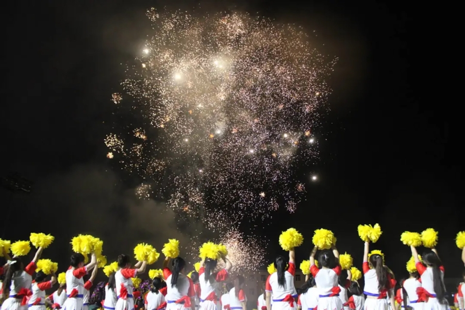 哨吹响,声激越,健美操表演拉开了开幕式文体汇演的序幕。一时间绿茵场上鼓、哨、乐、舞融为一体,动作张弛有力,队形变幻多样,节拍动感、振奋人心,裙裾翻飞、青春激昂,活力舞姿传递奋发向上的青春,热情表演点燃全场激情,充分诠释了青春的活力和美好。随后上演了舞龙舞狮、军体拳、花绳、扇子舞、擒拿拳、筷子舞、大型花球表演等精彩的文体节目,彰显了校运会将艺术与体育有机融合的特色,体现了赤峰学院青年学子品学兼优、全面发展的青春风采。文体汇演结束后,作为本次校运会开幕式备受关注和期待的节目之一——“大型烟花秀”在万人注视中震撼呈现,将现场气氛推向最高潮,全场瞬间沸腾欢呼!