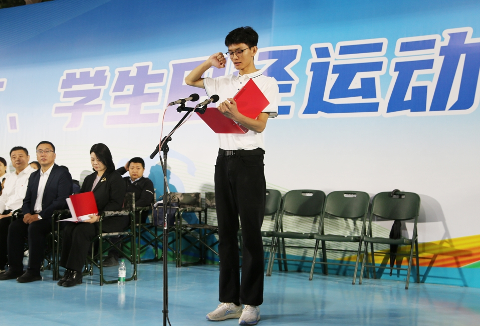 赤峰学院附属医院(临床医学院)的曹文卓、体育学院的郭佳琦分别代表运动员、裁判员宣誓。