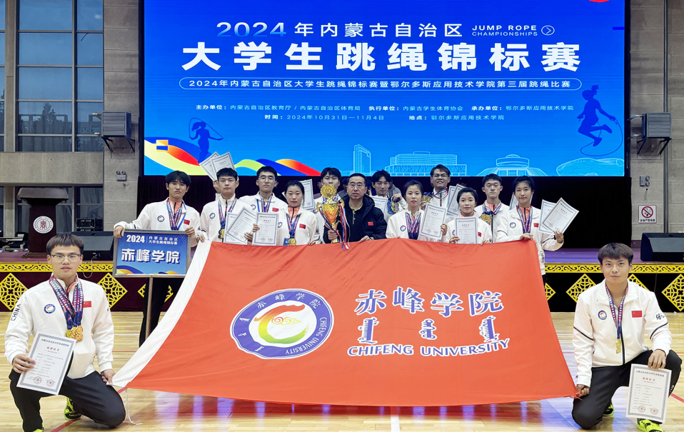 您所在当前位置: 首页 > 新闻动态 新闻动态 赤峰学院跳绳队斩获2024年内蒙古自治区大学生跳绳锦标赛本科超级组团体总冠军 时间:2024-11-04 来源: 作者: 11月2日至11月4日,内蒙古自治区大学生跳绳锦标赛在鄂尔多斯应用职业技术学院成功举办。全区共有15所高校的239名运动员参赛。我校体育学院教练员杨艳生带领跳绳队13名队员奔赴赛场,参与了7个个人项目、9个团体项目的比拼,获得11项冠军、7项亚军、4项季军,并以团体总分220的优异战绩斩获本科超级组团体总冠军。