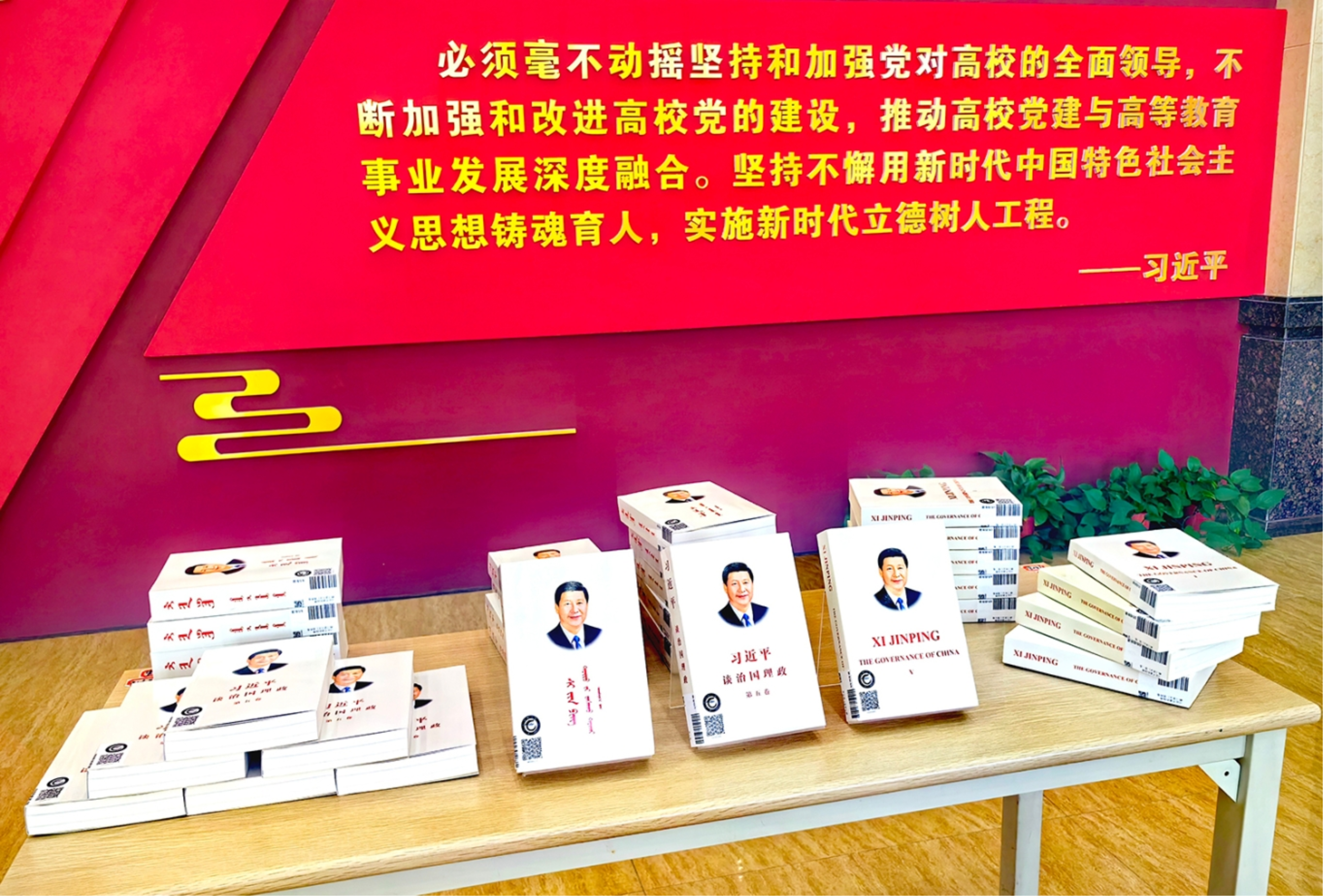 活动中,党员们梳理了馆藏《习近平谈治国理政》文献资源,将挑选出的中文版、蒙文版、英文版《习近平谈治国理政》第一至五卷摆放至图书馆南门厅红色阅读区,以方便广大师生借阅和学习。随后,大家围绕深刻把握《习近平谈治国理政》第五卷的时代背景和核心要义,深入领会习近平总书记在领导推进新时代治国理政实践中提出的具有原创性、时代性、指导性的思想进行了学习和讨论;格日乐和王菲两位党员还利用自身优势,分别用蒙、英两种语言为大家朗读了《习近平谈治国理政》第五卷的部分内容。大家一致表示,要把学习成效转化为行动自觉,切实把学习贯彻《习近平谈治国理政》第五卷转化为工作岗位上的生动实践。