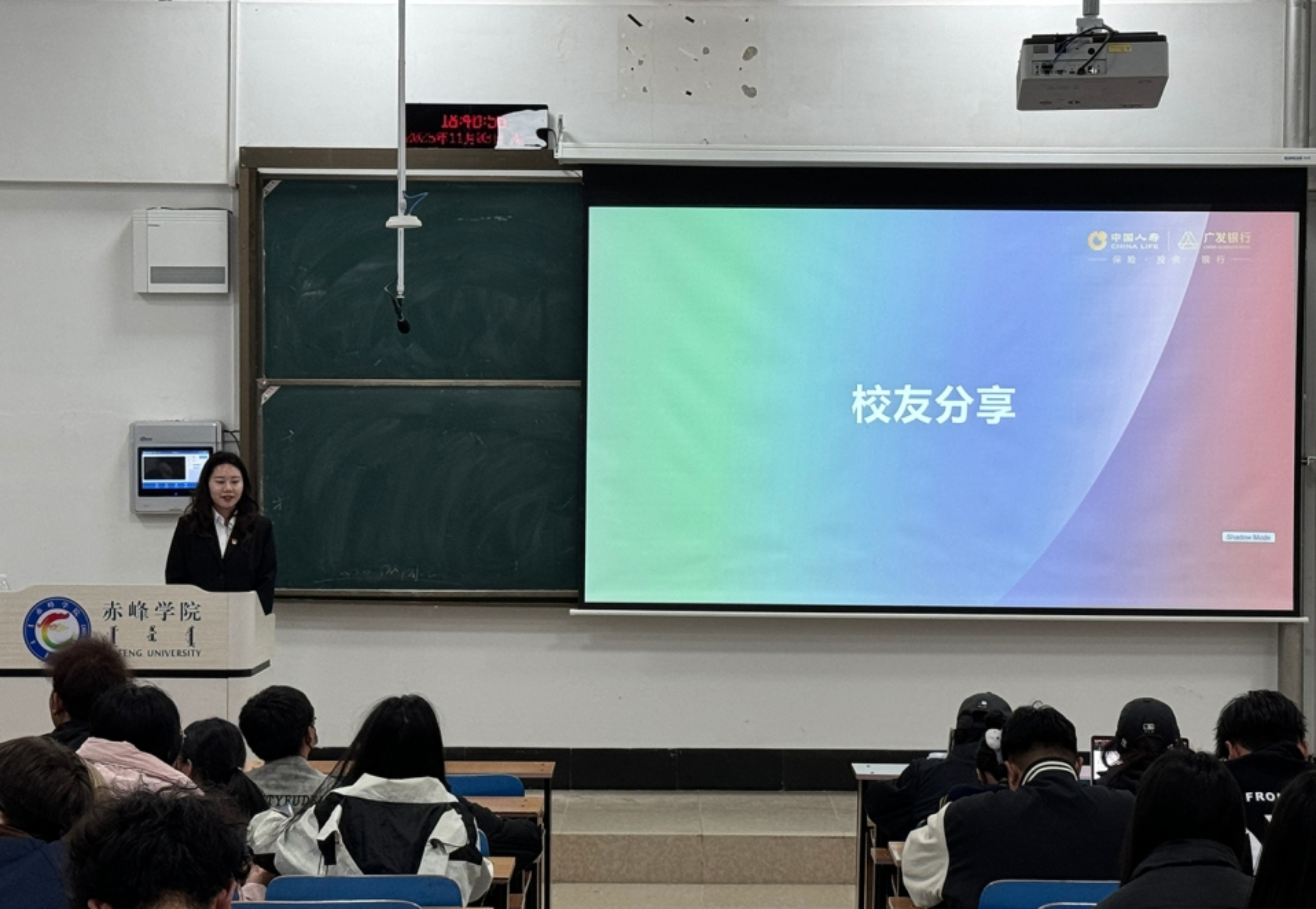 11月3日,中国人寿保险股份有限公司赤峰分公司专场宣讲会在崇学楼117教室举行。来自经济与管理学院、法学与商务学院、文学院等6个二级学院200名学生参加宣讲会。