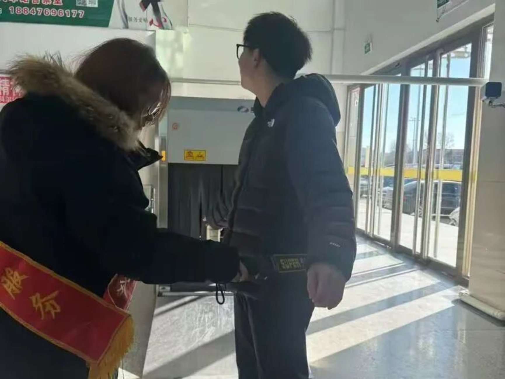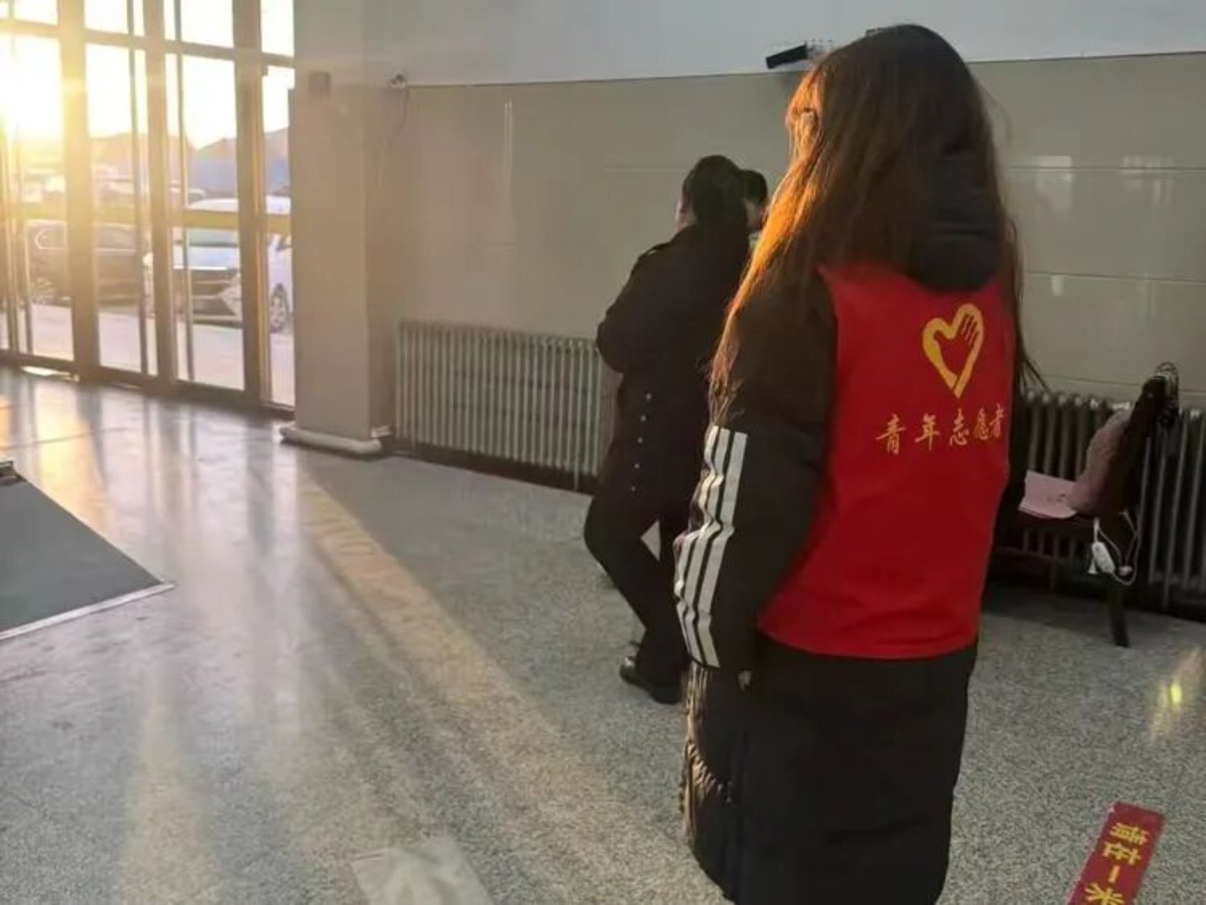 同一片冬日暖阳下,她转身换上迎宾绶带,立于交通枢纽入口处。红底白字的“迎宾”绶带在胸前醒目飘动,她伸手示意、微笑指引,与工作人员协同完成客流疏导与秩序维护。玻璃门外车流不息,门内她以沉稳姿态筑起春运平安的第一道温情防线——专业所长与志愿精神在此刻交汇,青年担当在岗位交接的指尖悄然落笔。