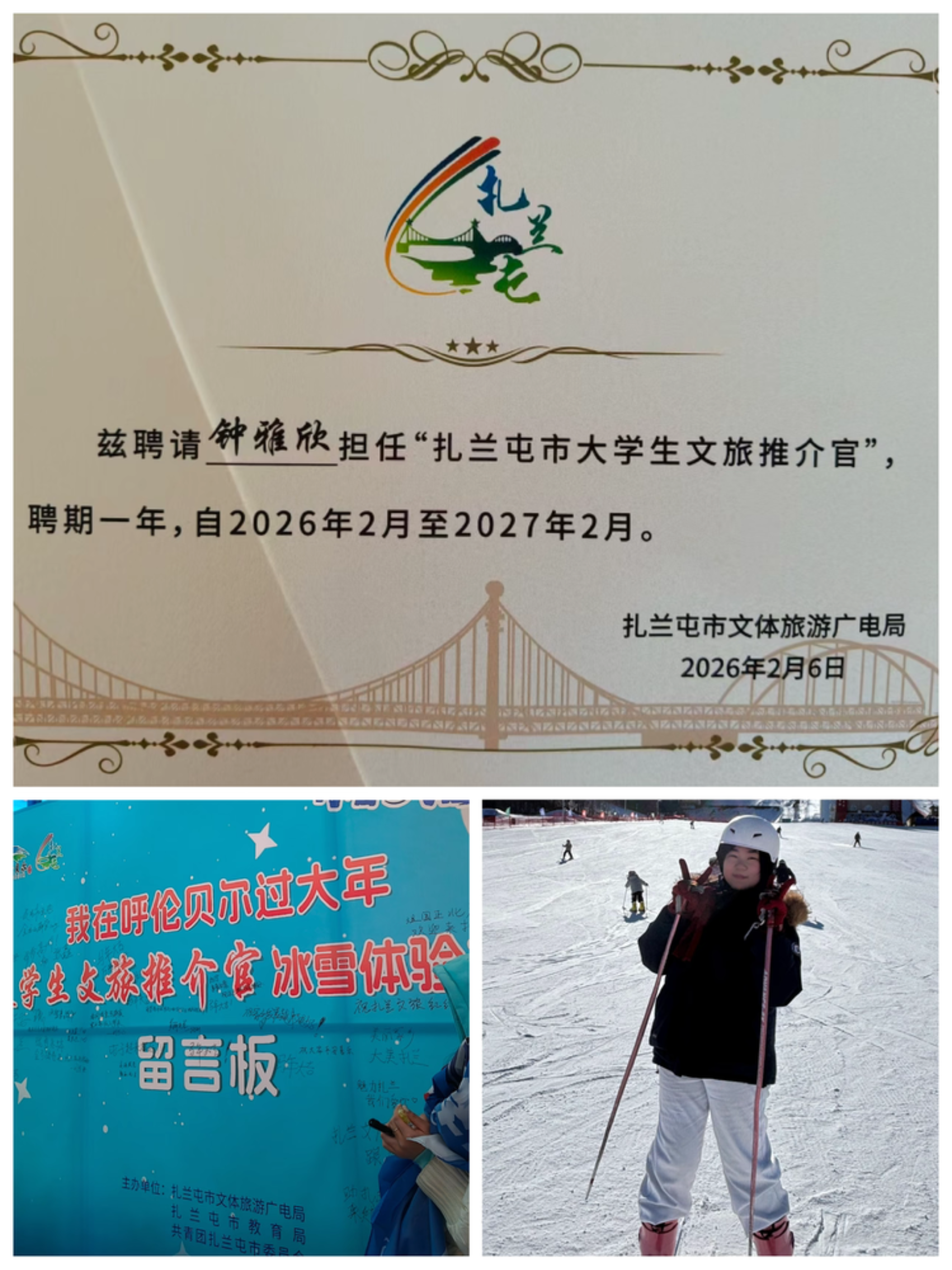 2024级音乐学一班的钟雅欣同学在这个寒假,以扎兰屯市大学生文旅推介官的身份,积极参与返家乡文旅推广志愿活动,从校园回归故土,用青春视角讲述扎兰屯故事。