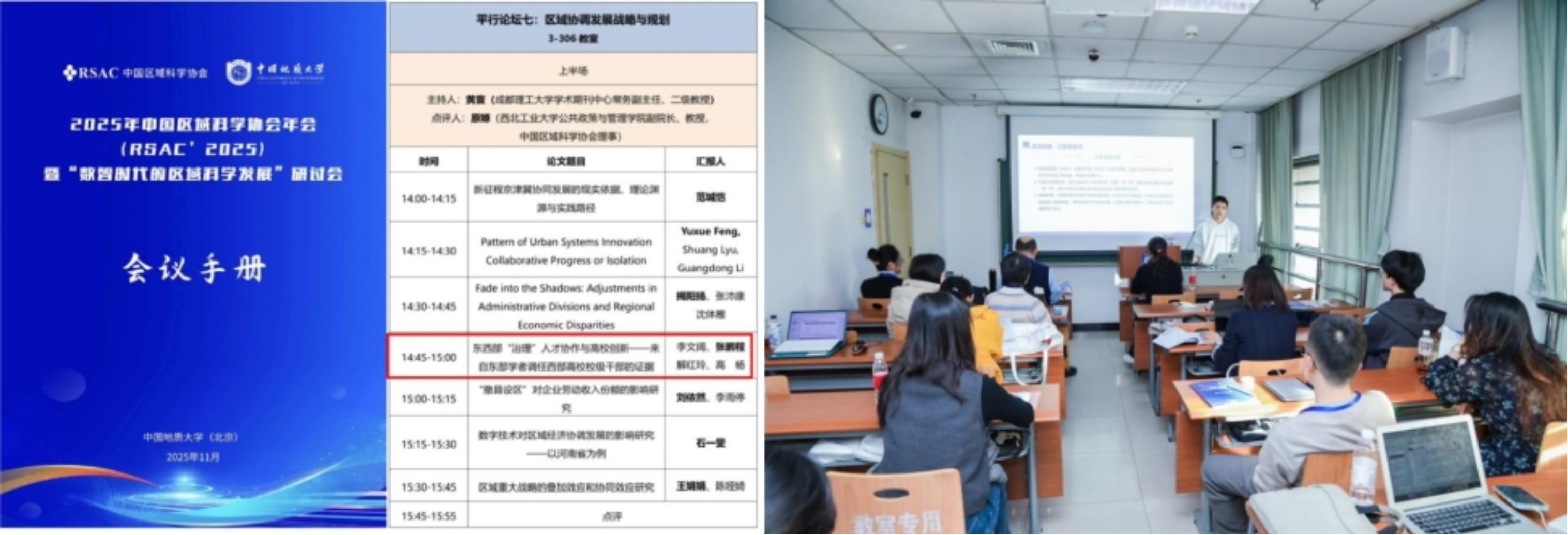 近日,2025年中国区域科学协会年会(RSAC’2025)在中国地质大学(北京)举行。经济与管理学院2024级会计专硕张鹏程同学与李文阔副教授,联合西北大学高杨教授、解红玲博士合著的学术论文《东西部治理人才协作与高校创新——来自东部学者调任西部高校校级干部的证据》被大会接收,并获邀在分论坛作汇报。