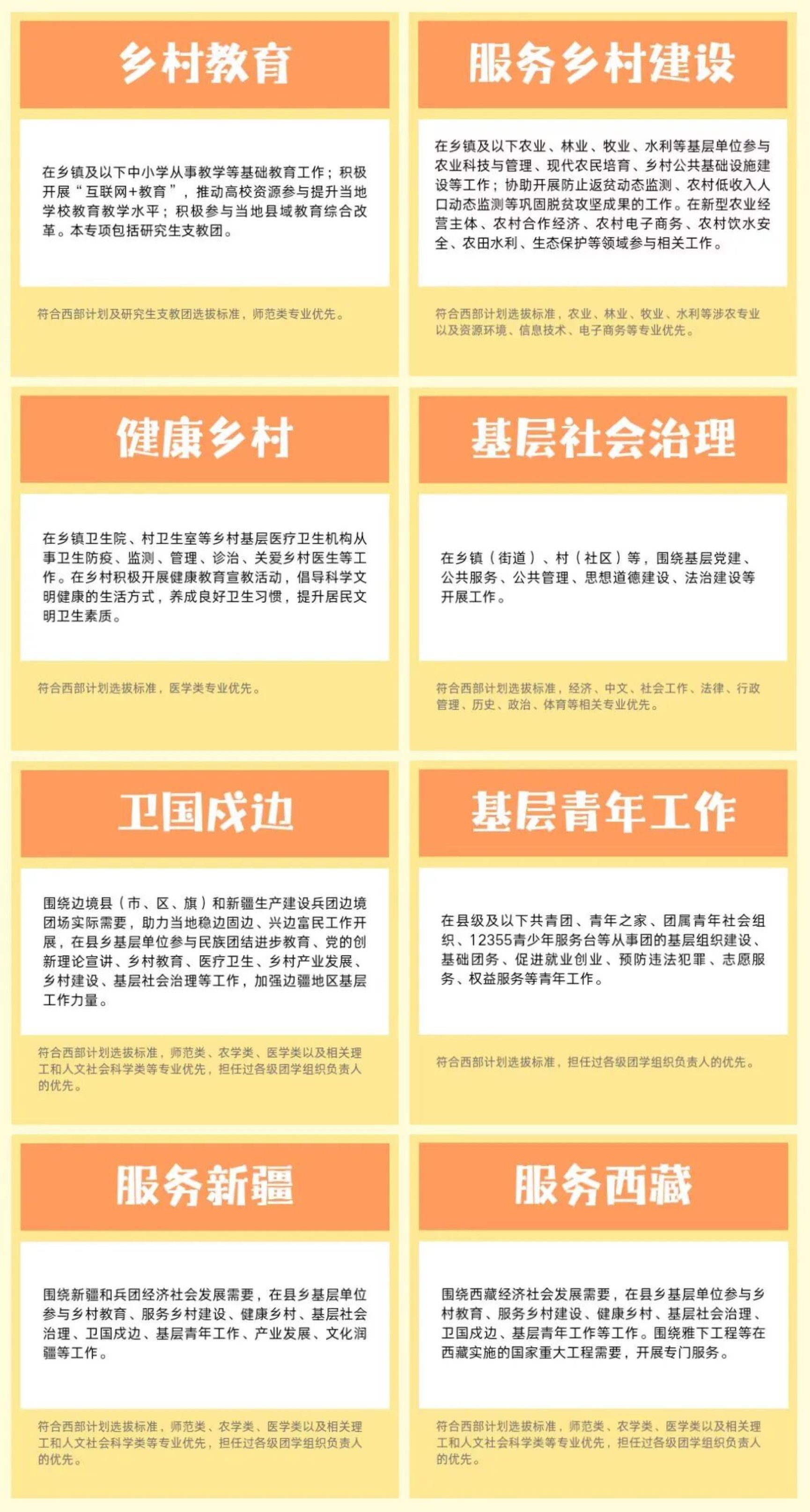 西部计划设置乡村教育、服务乡村建设健康乡村、基层社会治理卫国戍边、基层青年工作服务新疆、服务西藏8个专项西部计划志愿者服务期为1至3年服务协议一年一签