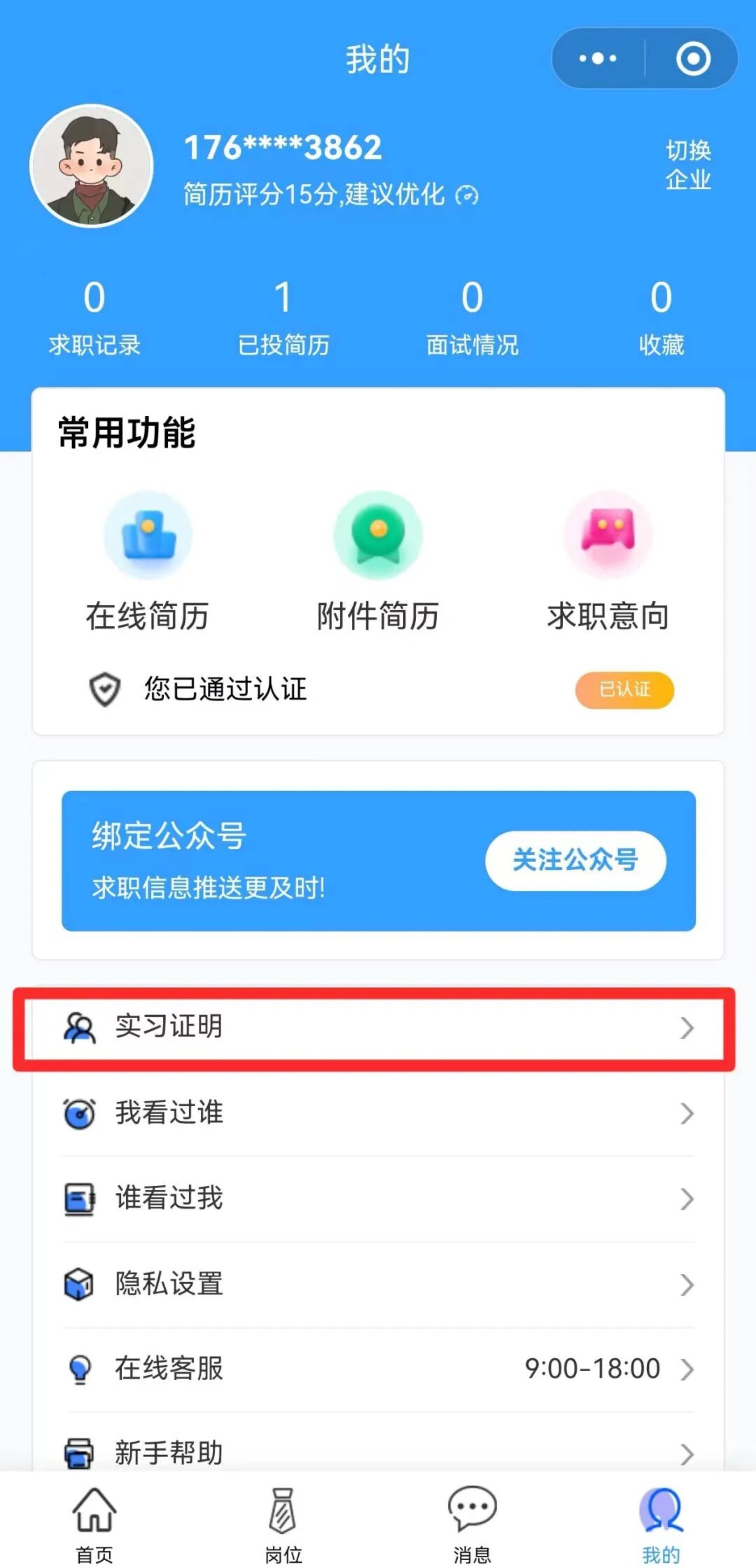 6.实习证明生成:实习结束后,完成规定的实习时长,通过【我的】页面点击【实习证明】提交申请,由用人单位确认无误后一键生成专属实习证明。