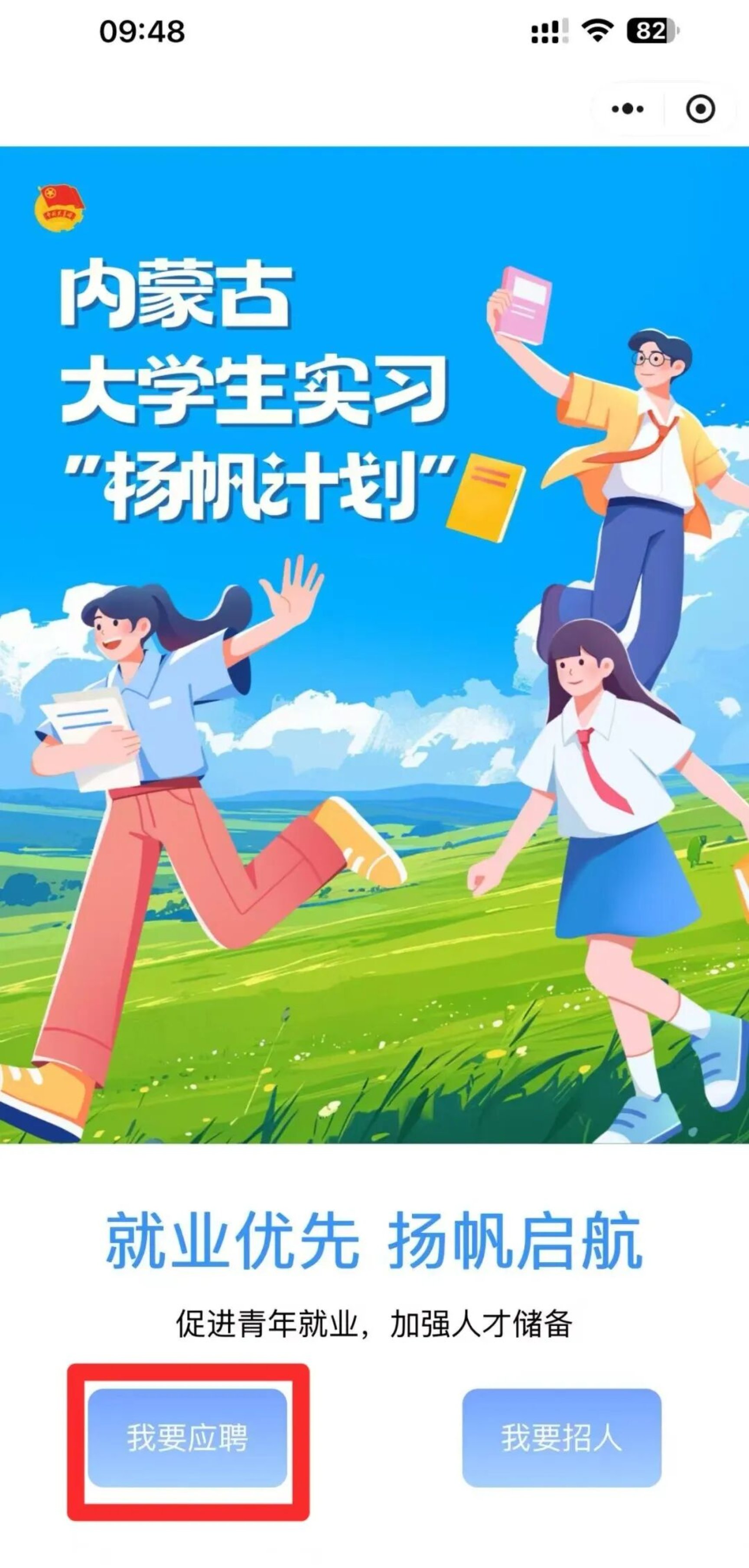 1.进入平台:微信搜索小程序“内蒙古青年就业服务平台”,或扫描文末专属二维码快速进入。