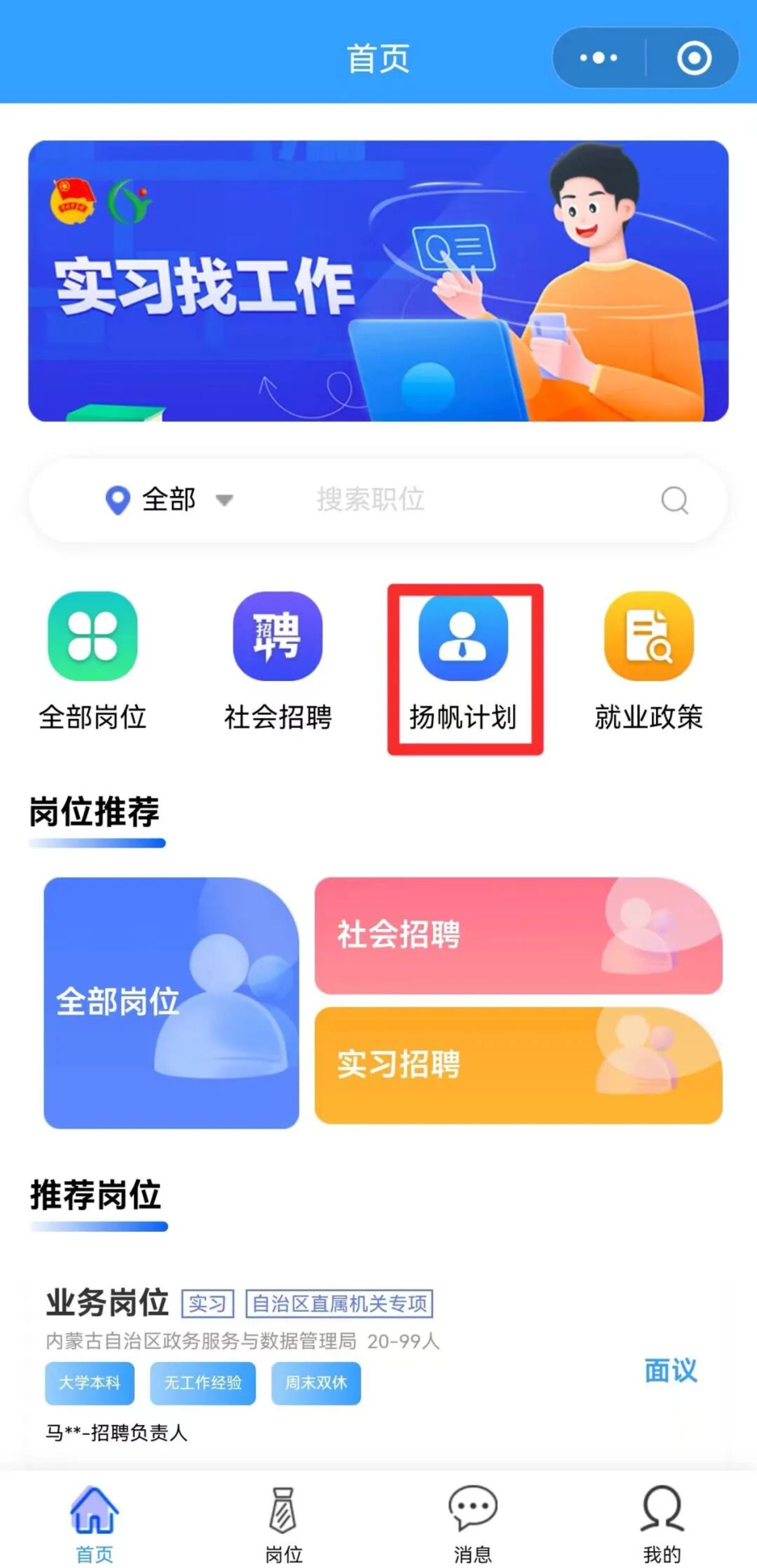 4.岗位投递:返回首页再次点击【扬帆计划】,可按地区(选择内蒙古各盟市)、岗位类型、实习时长等条件筛选岗位,查看岗位详情确认符合要求后,点击【投递简历】完成申请。可在【我的】-【投递记录】中实时查看进度与用人单位反馈。