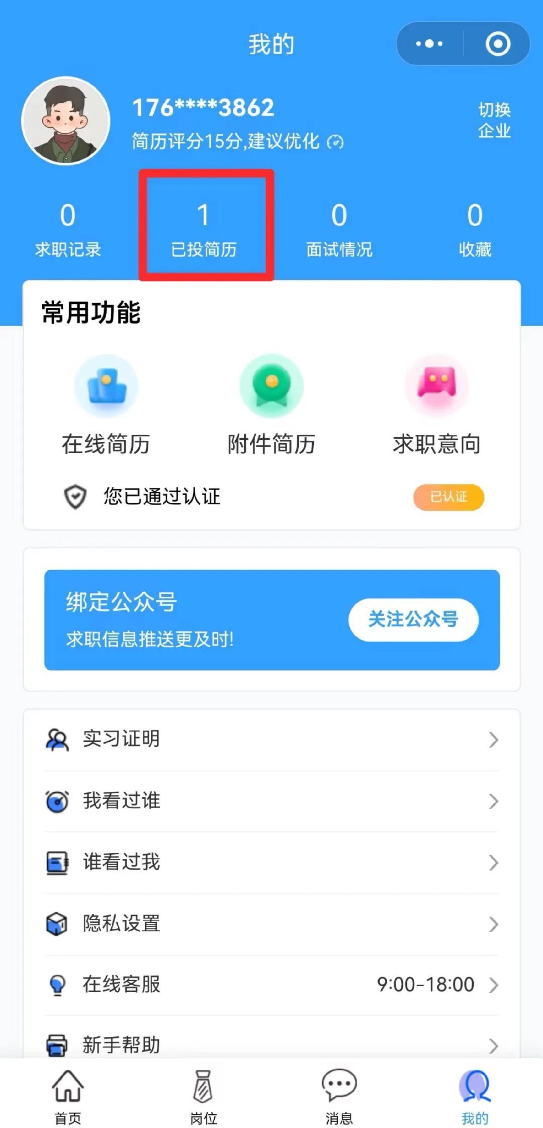 2.注册完善信息:点击页面右下角【我的】,首次登录需完成手机号授权,随后按提示认真填写并完善个人在线简历,确保信息真实准确,提交后等待平台审核反馈。