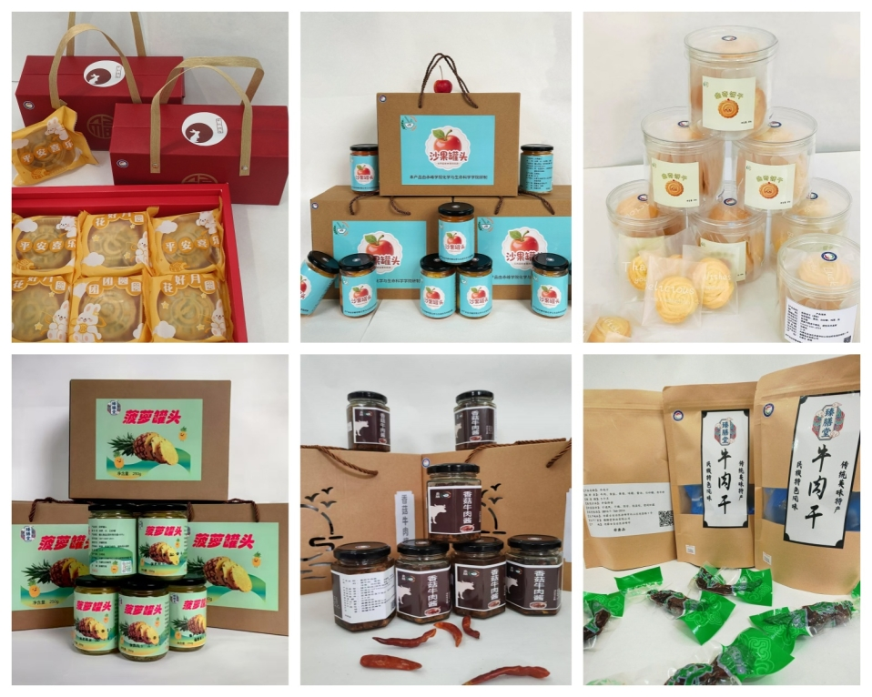 本次展出六款特色食品:低糖健康月饼、风味牛肉干、特色沙果罐头、手工曲奇饼干、菠萝水果罐头以及香菇牛肉酱。每种创新食品分设专属展示区域并配备试吃工具、分装容器和详细解释产品特色的易拉宝,现场安排师生专业引导,整体布置既整洁专业又方便参观品尝。