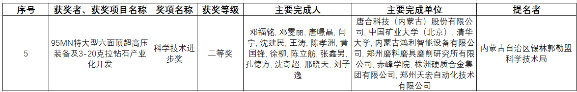 该项目牵头单位为唐合科技(内蒙古)有限公司,北京矿业大学、清华大学、赤峰学院等多家单位共同合作完成。项目实现了特大型六面顶压机的设计、制造以及在超硬材料领域的应用,解决了超硬材料领域的关键技术性难题。