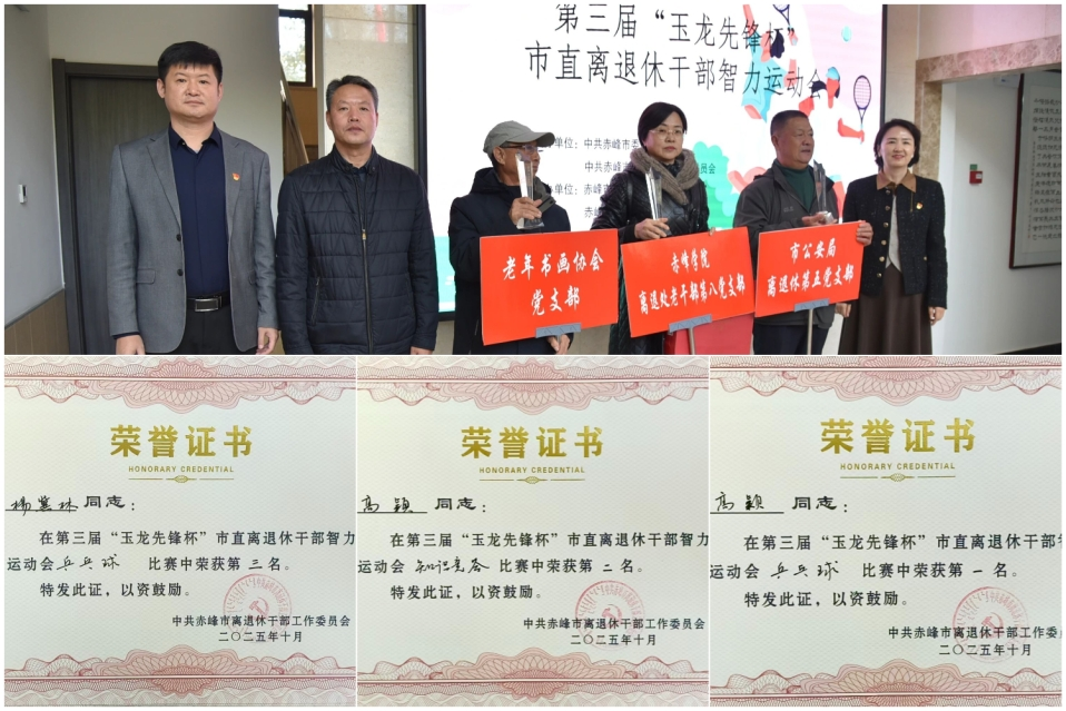 10月28日,赤峰市离退休干部工作委员会举办第三届“玉龙先锋杯”市直离退休干部智力运动会,设置了铸牢中华民族共同体意识知识竞答、中国象棋、赤峰对调、乒乓球等多个竞赛交流项目。我校离退休人员工作处党总支17位退休党员组队参赛,经过多轮角逐,最终,高颖获得知识竞赛第二名,高颖、杨冀林分别获得乒乓球组一等奖和三等奖,离退休人员工作处党总支第八党支部位列团体总积分第一名。