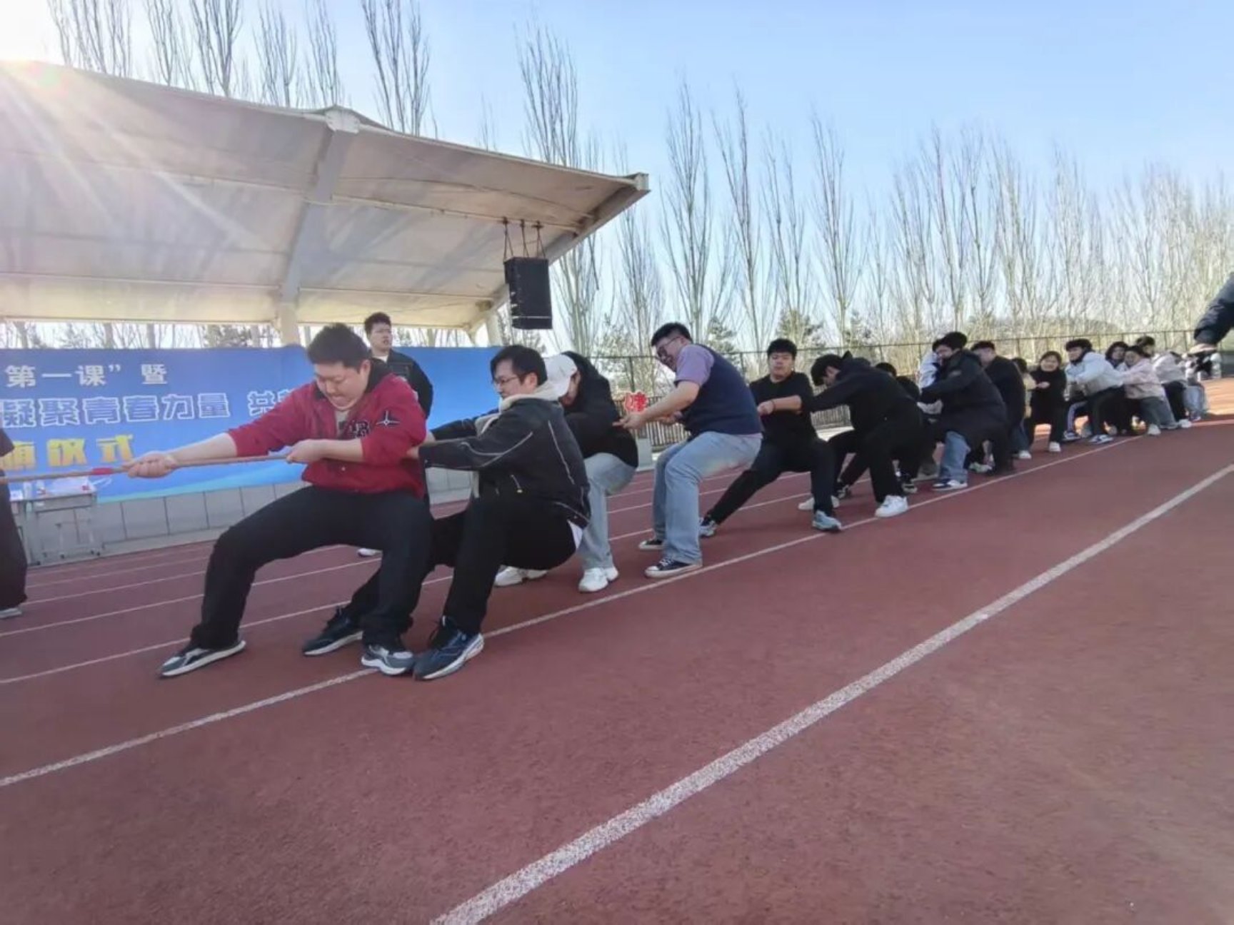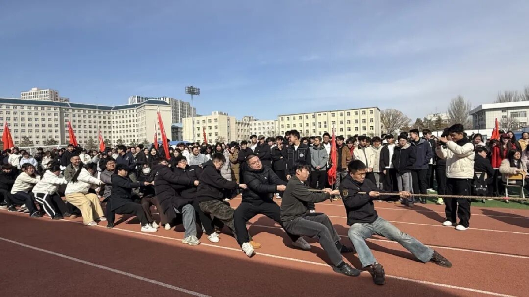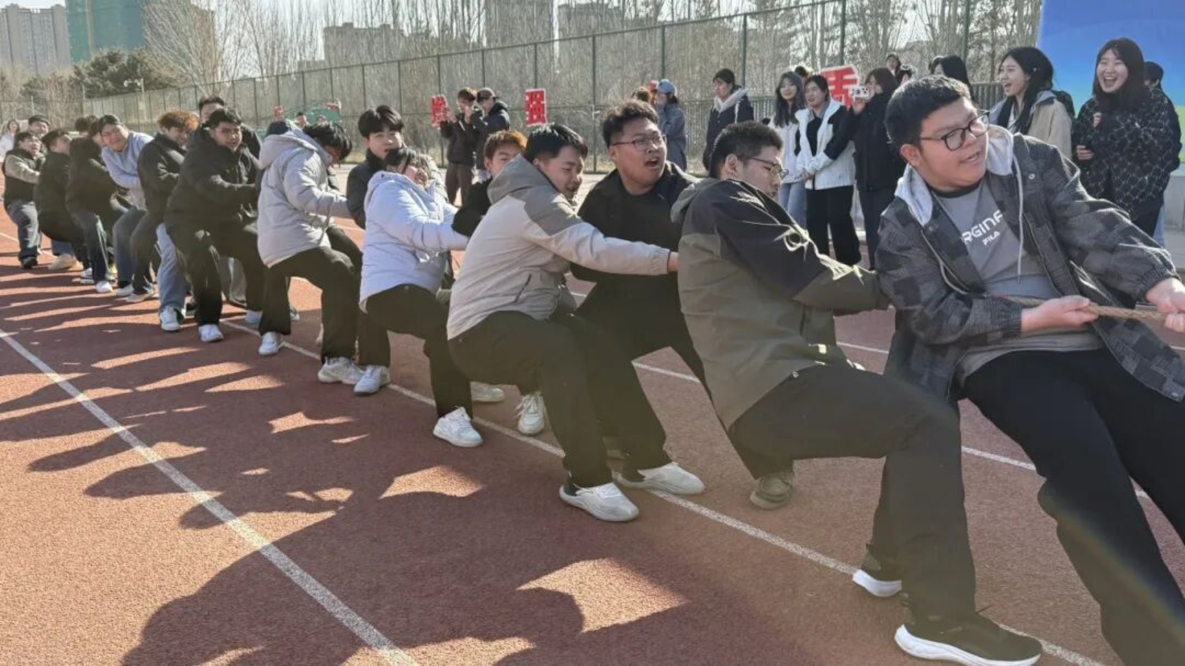 为落实立德树人根本任务,丰富校园文化生活,进一步增强学生体质、锤炼意志品格,营造团结奋进、文明和谐、积极向上的校园育人氛围,展现青年学子昂扬向上的精神风貌,3月14日,“凝心筑梦新征程 团结奋进向未来”学生拔河比赛预赛在田径运动场举行。本次比赛由校团委主办、校学生会承办,是首届校园文化节子活动,22支二级学院男女混合代表队参赛,体育学院担任裁判,保障赛事公平有序开展。