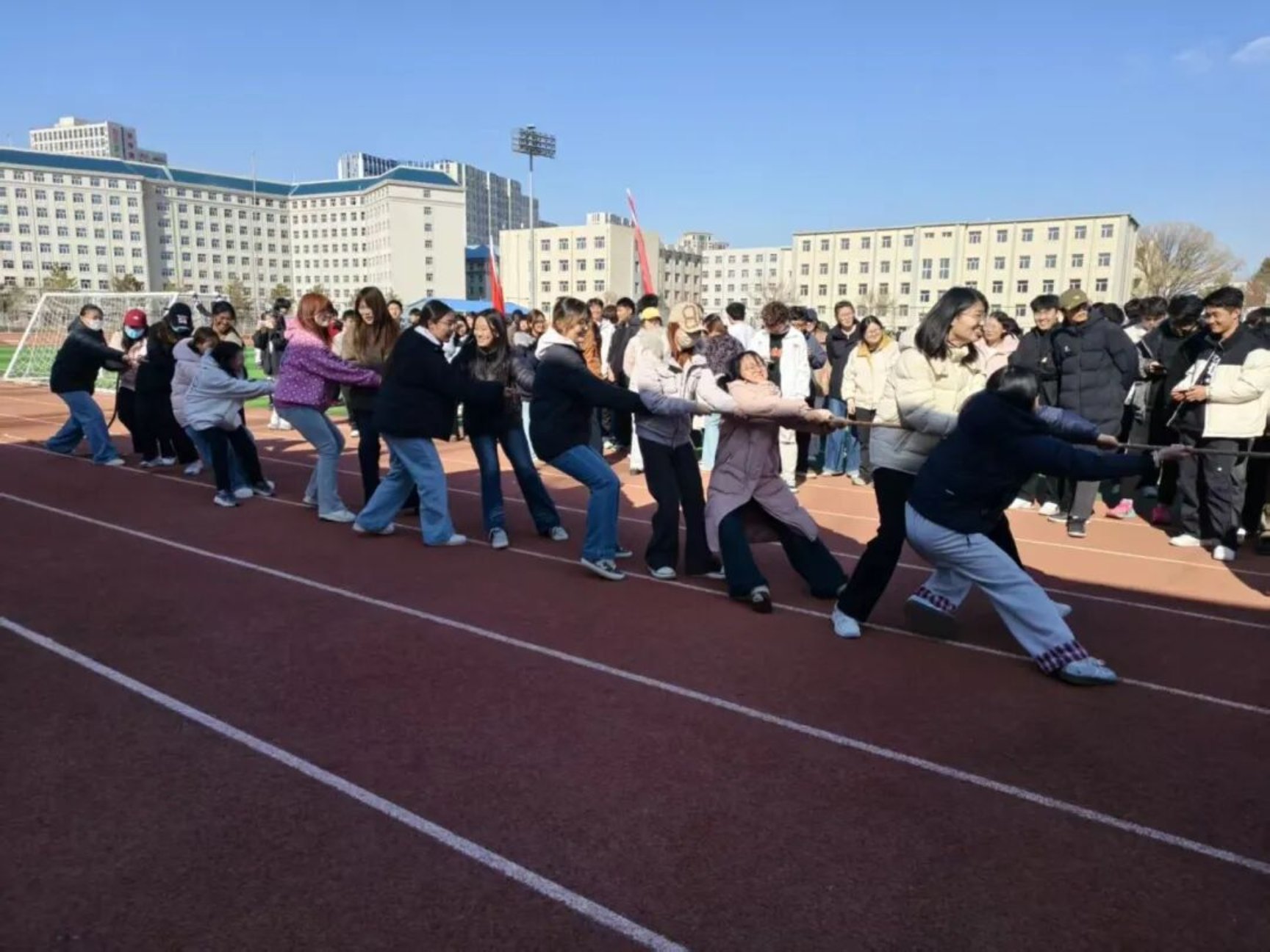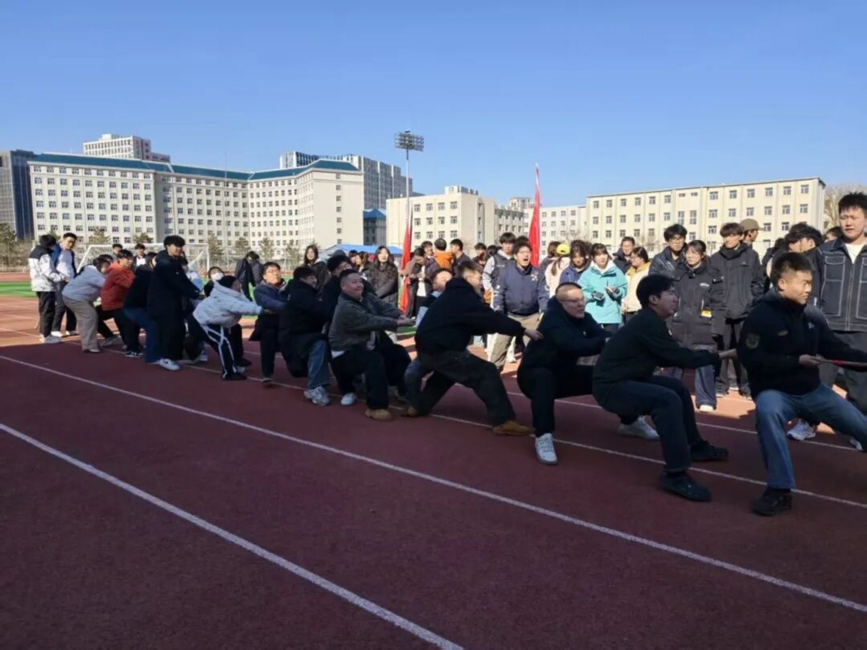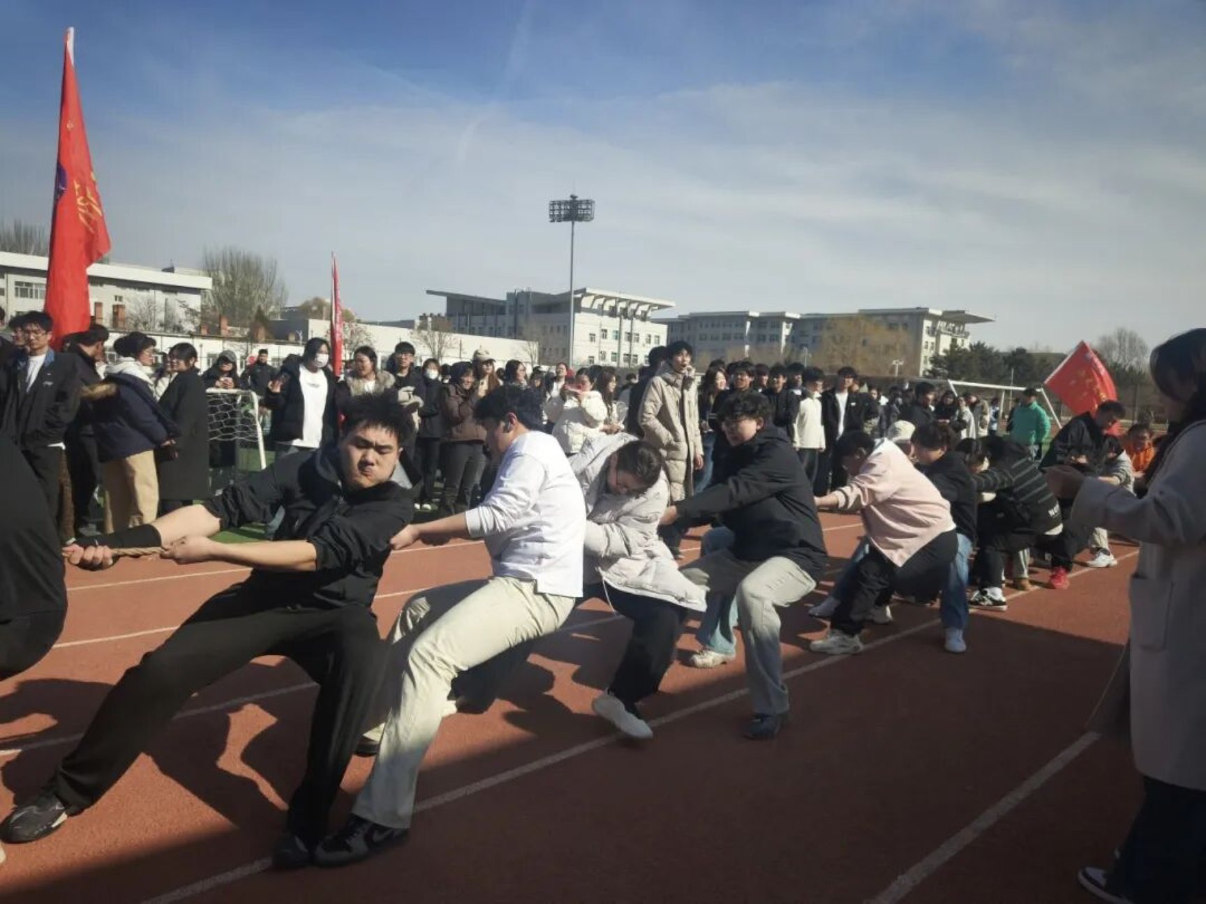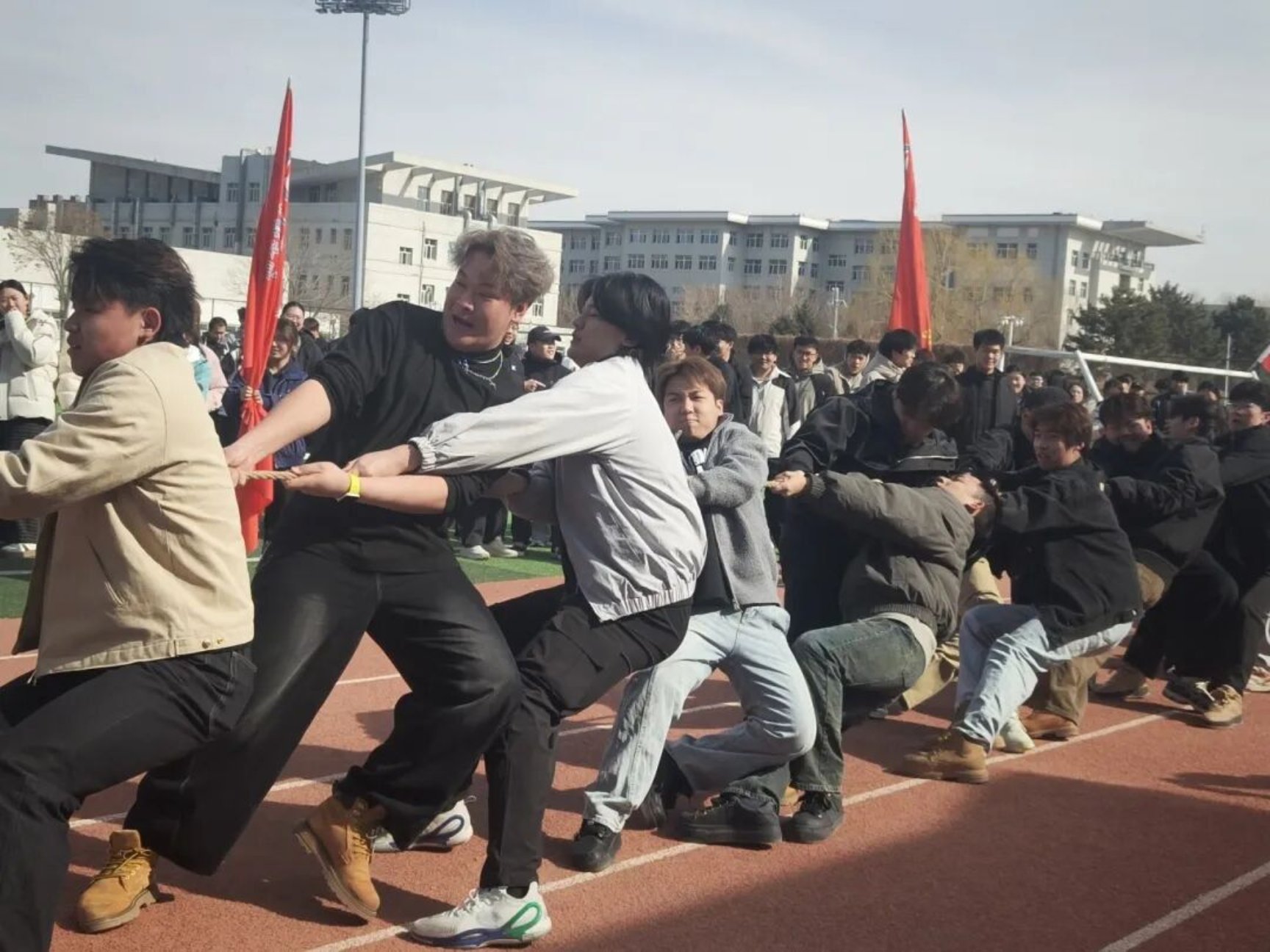 为落实立德树人根本任务,丰富校园文化生活,进一步增强学生体质、锤炼意志品格,营造团结奋进、文明和谐、积极向上的校园育人氛围,展现青年学子昂扬向上的精神风貌,3月14日,“凝心筑梦新征程 团结奋进向未来”学生拔河比赛预赛在田径运动场举行。本次比赛由校团委主办、校学生会承办,是首届校园文化节子活动,22支二级学院男女混合代表队参赛,体育学院担任裁判,保障赛事公平有序开展。