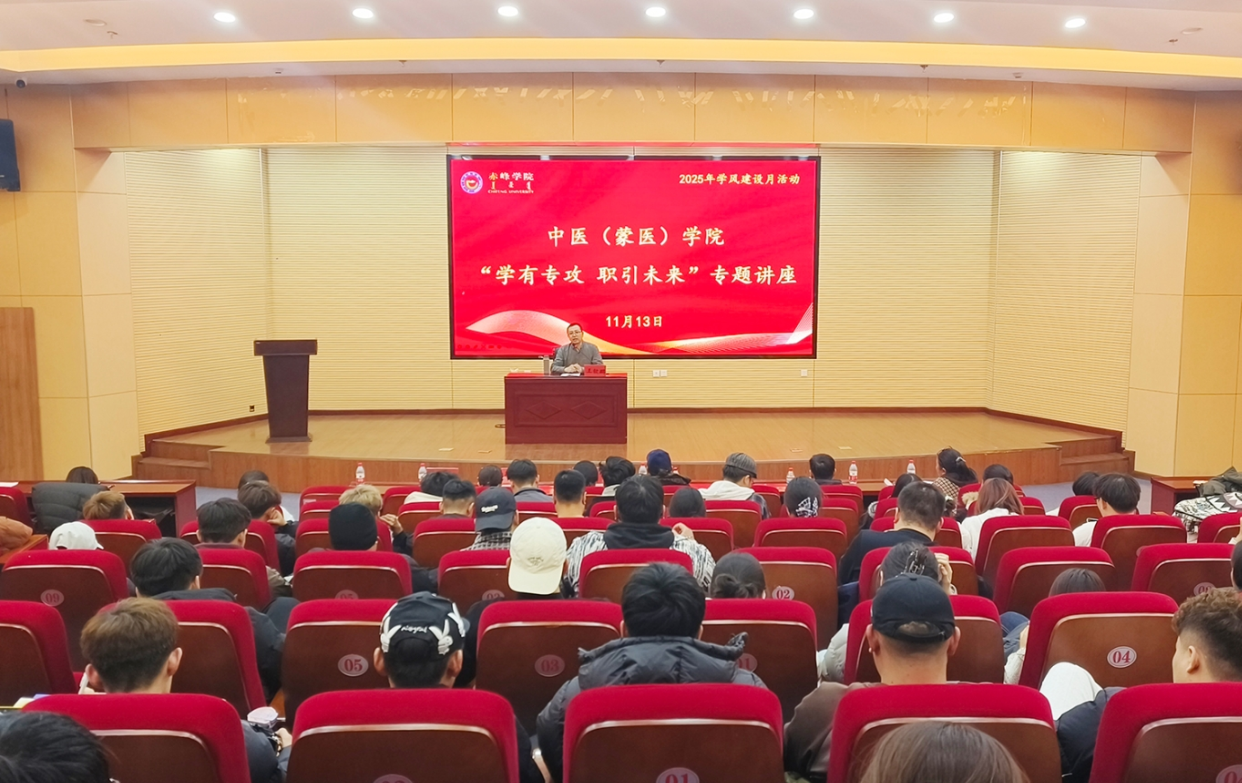 11月13日晚,中医(蒙医)学院在博物馆二楼学术报告厅举办“学有专攻 职引未来”专题讲座。学院班子成员、相关科室和专业负责人、班导师、辅导员、全体在校生聆听讲座。