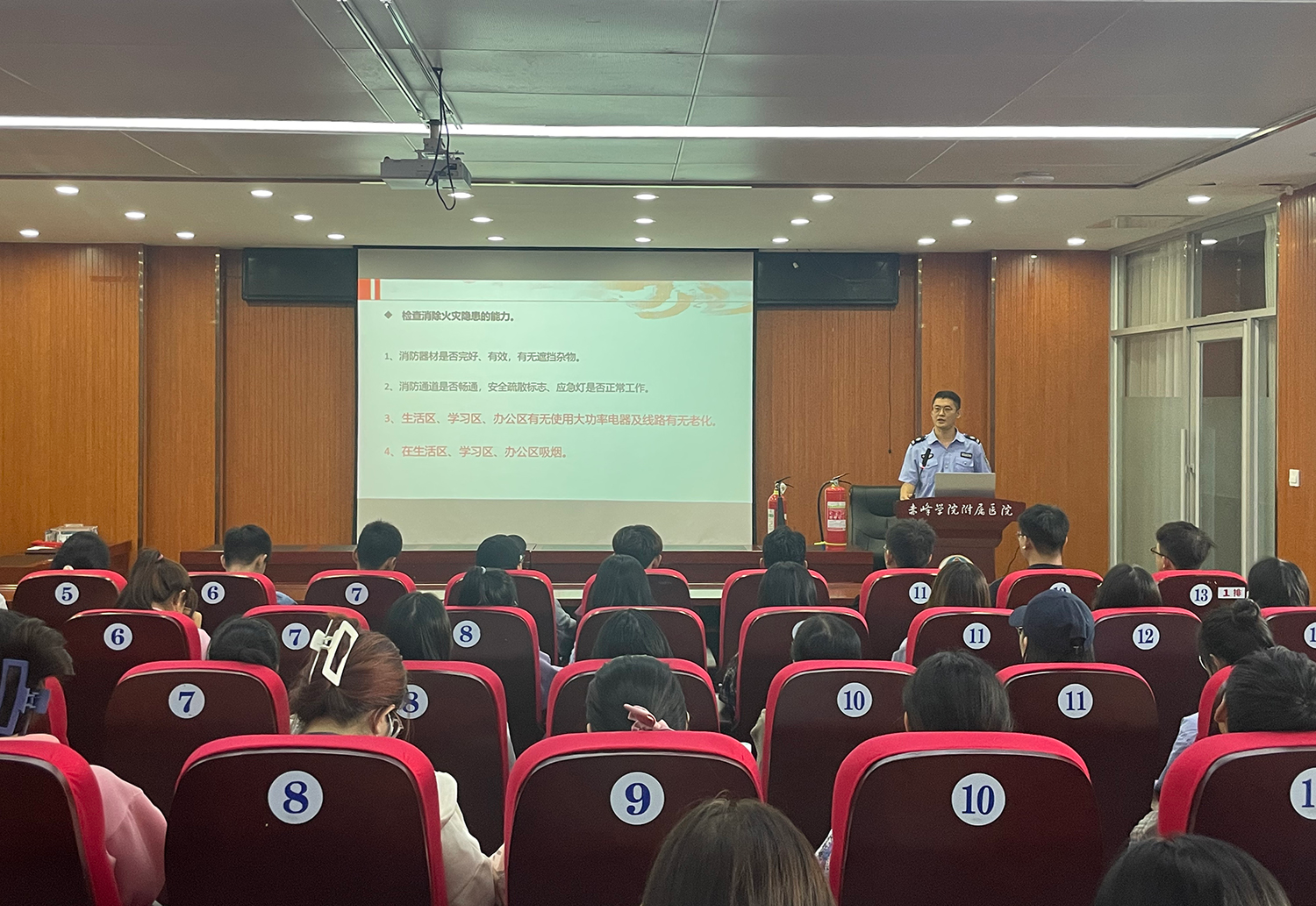 在消防培训环节,附属医院保卫科刘宗南老师从主体责任的落实、消防“四个能力”建设、常见消防器材使用方法等方面进行了专题讲授;在安全应急疏散演练中,全体学生在老师和疏散引导员的指挥下,在最短时间内,有序安全地撤离到了规定安全区域,随后,各楼层网格长整顿队伍并清点人数,演练圆满结束。