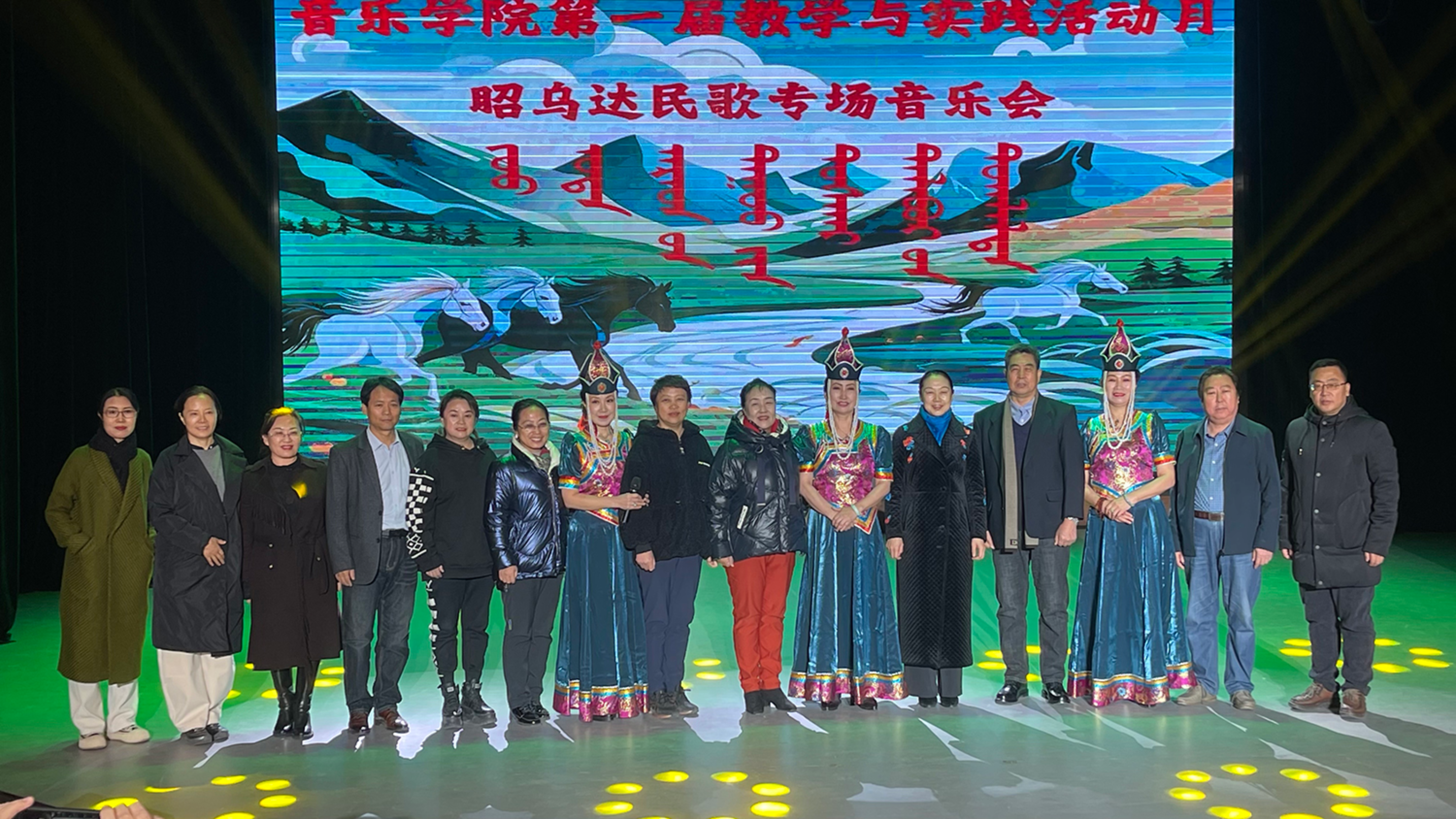 昭乌达民歌起源于农耕文化与游牧文化交融的赤峰地区,分为长调民歌和短调民歌两类,其风格雄浑古朴,刚健豪迈,高亢嘹亮,素有“草原咏叹调”之称,是蒙古族音乐文化的宝贵财富。2018年和2022年,昭乌达长调民歌和短调民歌先后入选自治区级非遗代表性项目名录。据不完全统计,目前有千余首昭乌达原创民歌流传于世,部分经典歌曲至今依然广为传唱,深受广大群众喜爱。从内容上,昭乌达民歌主要分为赞歌、颂歌、宴歌、思乡曲、婚礼歌、情歌及叙事曲七类。此次音乐会所选曲目涵盖了上述各种类别与内容。参演此次音乐会的春花、敖特根其木格、乌红梅老师在多年教学与艺术实践中一直致力于蒙古族传统民歌的研究与传承,他们的精彩演唱形式新颖、韵味悠长、饱含深情,将观众带回到了古老文明的昭乌达原生态时代,充分展现了昭乌达地区的民俗风情,为现场观众上了一堂生动、活泼的非遗保护宣传课,引发了强烈情感共鸣,有利于推动音乐学院民族艺术研究工作再上新台阶。