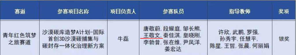 中国国际大学生创新大赛以专业严谨的赛事要求和全域覆盖的参与格局为依托,汇聚了全国多所高校顶尖创新力量参与角逐。在赛事备赛阶段,王敬文同学立足专业领域深耕细作,历经数月与队友一同完成数据论证与方案打磨,以精益求精的态度攻克多个技术与实践难题,为赛事角逐筑牢坚实基础。现场展示环节,王敬文所在团队锚定“沙漠碳库造梦A计划——国际首创3D沙漠碳捕集与碳封存一体化治理新方案”,依托深厚专业积累、独特创新视角与精彩现场演绎,全面解读该方案在沙漠治理与碳循环领域的创新突破、技术优势与市场前景,以兼具环保价值与实践意义的项目实力赢得评委一致认可。