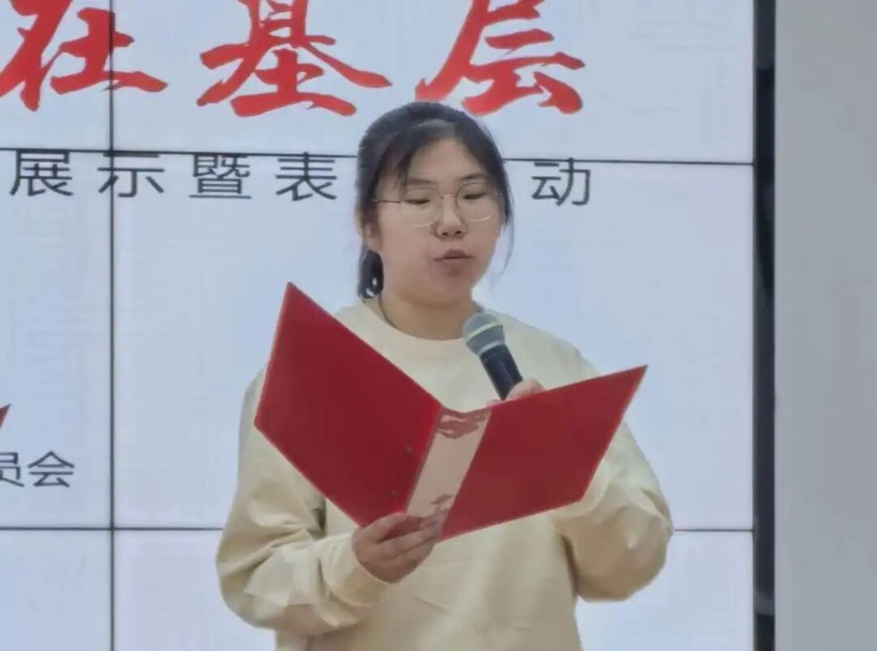 本次成果展示暨表彰活动旨在展现“大学生党员进社区”项目成果,进一步激发广大青年学生参与基层治理的热情,促进校地互动、经验共享与情感融合。校团委社团管理与素质拓展部部长李根受邀作为高校教师代表讲话,我校基础医学院2025级药学班学生、学校晨初社成员李宏颖、姚鑫然两位同学受邀作为高校学生代表发言,抒发服务基层感想,并参与演出了文艺演出环节的诗朗诵节目。在表彰环节中,我校李宏颖、姚鑫然两位同学荣获“街校共建优秀志愿者”光荣称号。