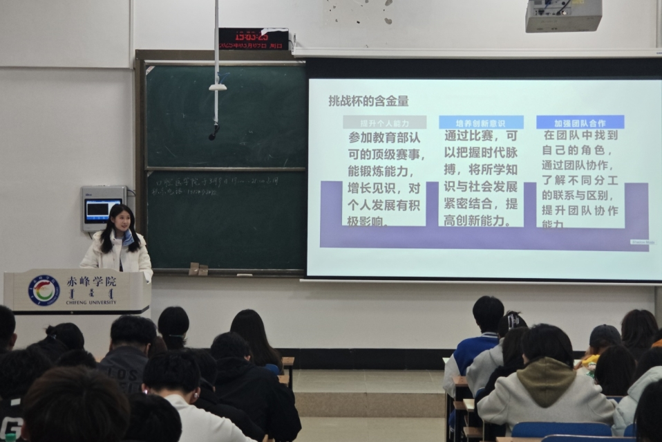 您所在当前位置: 首页 > 院系风采 院系风采 口腔医学院举办第十三届“挑战杯”经验分享会暨第十四届“挑战杯”赛前动员大会 时间:2025-03-10 来源: 作者: 3月9日,口腔医学院举办第十三届“挑战杯”经验分享会暨第十四届“挑战杯”赛前动员大会。分享会上,董芷言、任宏洋、张佩凤、徐明烁四名曾在“挑战杯”自治区级比赛中获奖的同学分别从灵感来源、队友选择、论文亮点、参赛经验等方面作了分享,帮助同学们搭建了创新思维与实践能力的跃升平台,点燃了同学们的参赛热情,为口腔医学院学生未来更好地参加比赛打下基础。