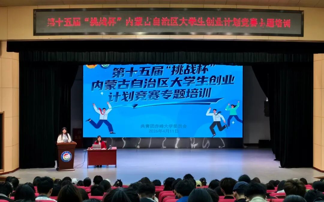 为进一步提升学校参加第十五届“挑战杯”内蒙古自治区大学生创业计划竞赛的组织水平和项目质量,帮助师生更好把握赛事要求、理清备赛思路、提升项目打磨能力,4月11日,校团委在赤峰大学大剧场举办“挑战杯”大学生创新创业赛事专题培训。校团委全体成员、2026年度学校参与“挑战杯”竞赛的各团队成员、指导教师等参加培训。校团委副书记卢启阳主持培训。