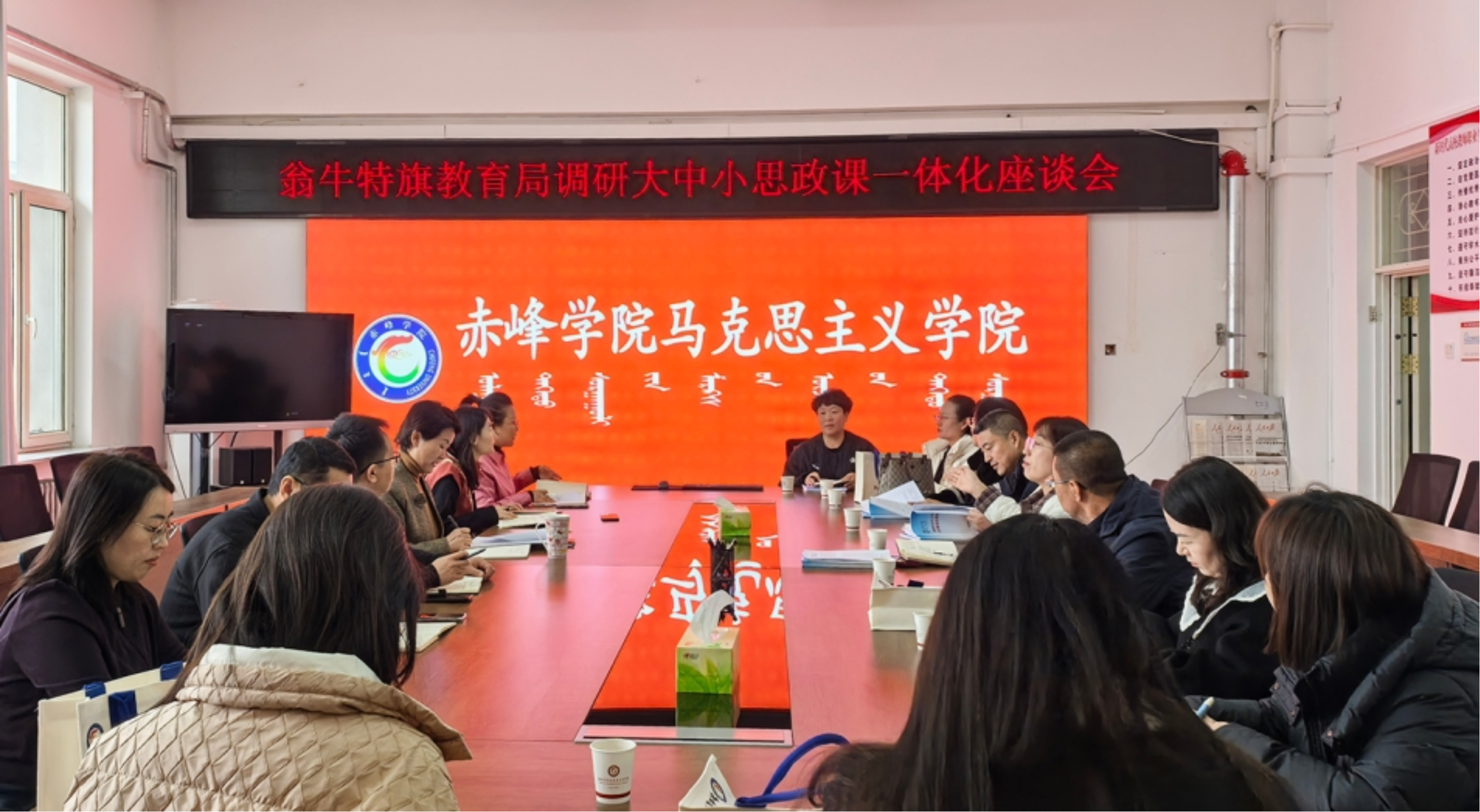 11月7日,翁牛特旗教育局副局长张敏带领全旗各学段教师代表一行10人到马克思主义学院开展大中小学思政课一体化建设座谈会,马克思主义学院班子、教师代表参加座谈。