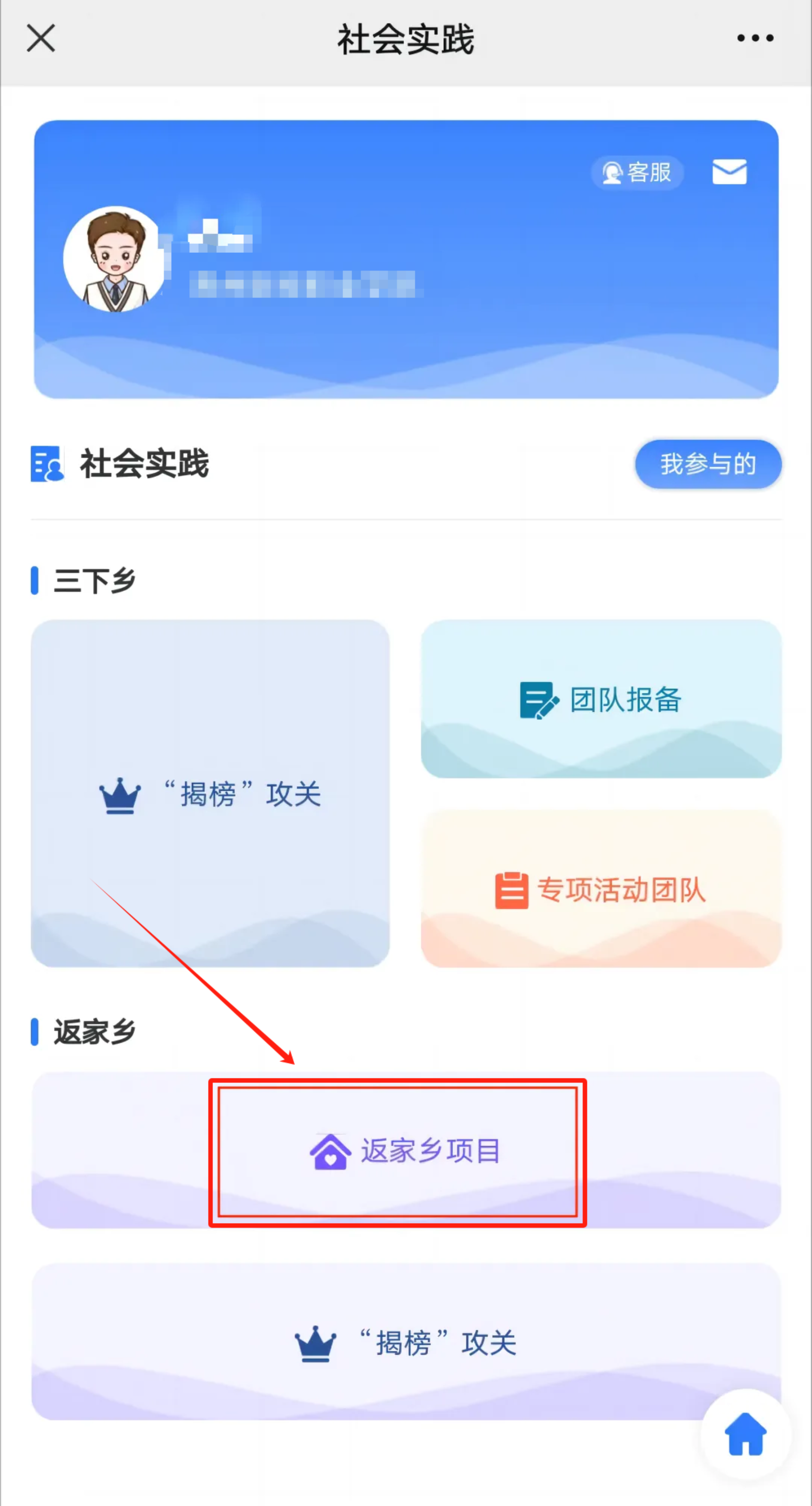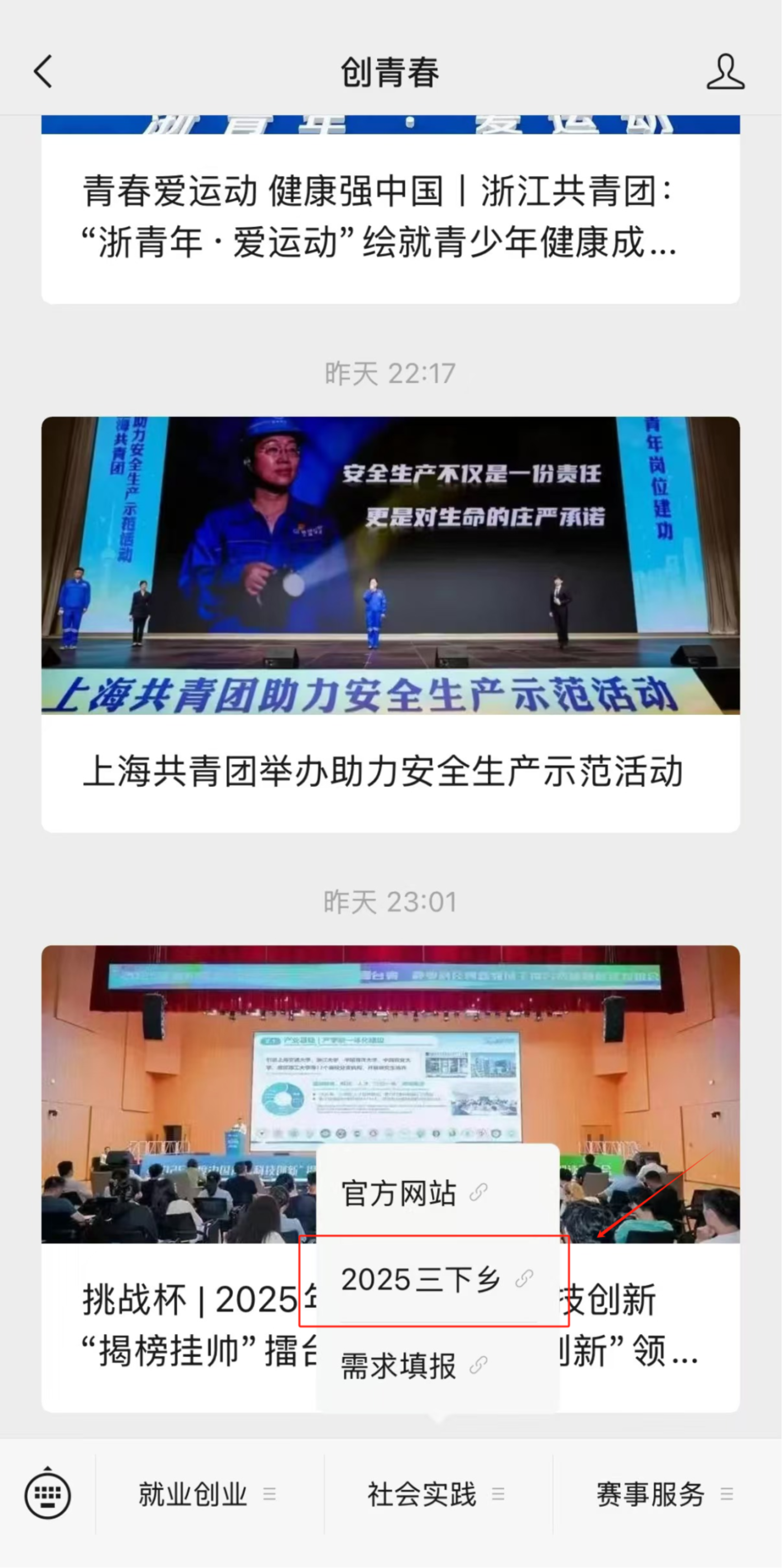 2.通过“创青春”公众号报名。关注“创青春”微信公众号,选择“社会实践”-“2025三下乡”-“返家乡”。首次登陆用户需按提示注册账号并返回登录,已注册的学生或有高校第二课堂成绩单系统账号的学生可直接登录。登录成功后点击”返家乡项目”-项目列表,浏览单位发布的项目信息,浏览项目信息详情,选择中意的项目报名。