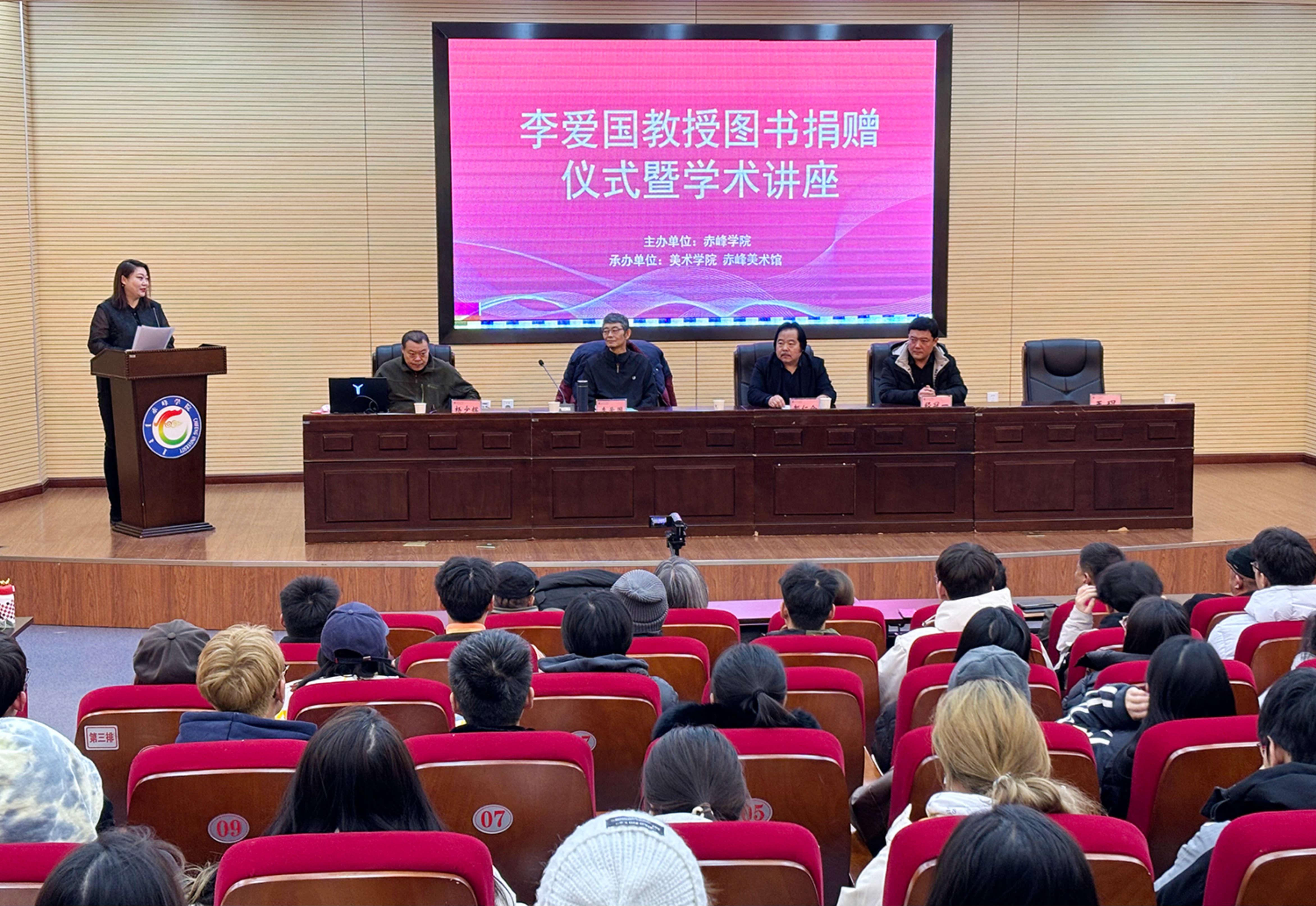 11月9日上午,由赤峰学院主办,美术学院、赤峰市美术馆承办的中国国家画院李爱国教授图书捐赠仪式暨学术讲座在博物馆二楼学术报告厅举行。赤峰市美术馆党支部书记杨少辉、馆长经冠一,美术学院院长都仁仓、副院长王琨、专业教师和学生代表共200余人参加仪式。