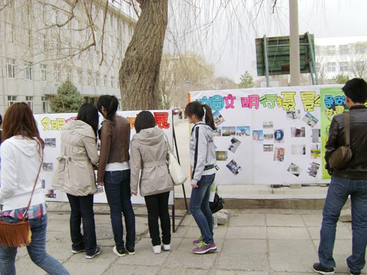 明行“摄影展,吸引了众多老师和同学的关注。活动现场共展出了摄影作品50余幅,并配以文字说明,反映了发生在学校各个角落的各种文明与不文明现象,涉及校园环境、学习、生活、卫生等各个方面。楼道里的烟头、课桌上东倒西歪的字迹、多媒体室内随意丢弃的垃圾等。这些摄影作品展览,一针见血地指出了我们大学生的一些不文明行为。此次展览对进一步倡导大学生抵制不文明行为,提高文明素质、从我做起、从现在做起,促进校园和谐发展,争做文明大学生有一定的积极促进作用。