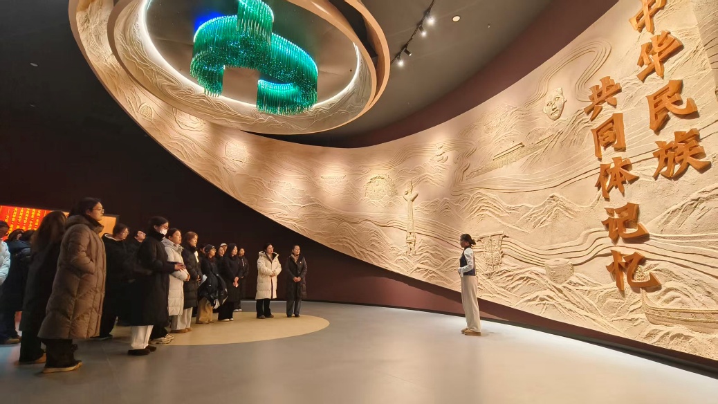 赤峰市铸牢中华民族共同体意识宣传教育基地选址赤峰学院,共规划了体验区、展览区、功能区和实践区4大功能区。活动中,讲解员首先带领大家参观了“党的民族工作百年大事记——中国特色解决民族问题正确道路”,通过文字、图片、视频等形式系统展示了党的民族工作中的重要会议、重要任务和重要时间,讲述中国共产党创造性地把马克思主义民族理论同中国民族问题具体实际相结合,走出一条中国特色解决民族问题正确道路的百年历程。随后,大家前往“中华民族共同记忆”体验区进行体验。师生们在七大主题展厅中,通过文物图片、数字交互、场景复原等,身临其境,听见中华,看见中华,感知中华,全方位、立体化了解体味了中华民族共同体的历史逻辑与实践路径。