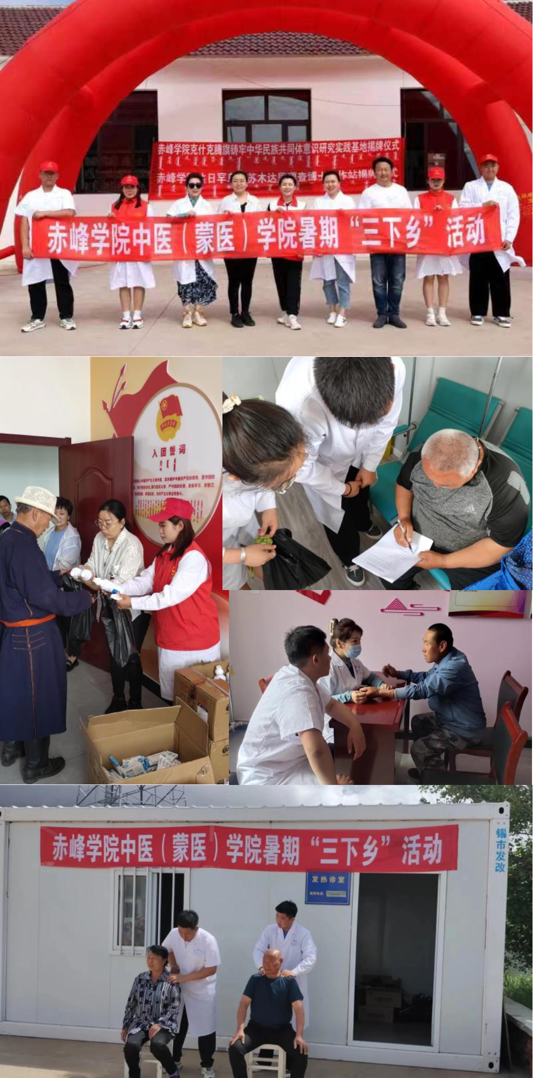 活动分别在克什克腾旗在达尔罕乌拉苏木达里嘎查、锡林浩特市巴彦宝拉格苏木开展。红石榴党建家(+)志愿服务队成员为当地有需要的群众进行了包含量血压、健康指导、中成药建议、推拿按摩等多元化项目的义诊;部分学生示范八段锦、发放香囊并讲解香囊的功效等,宣传中蒙医药的优势。周边的牧民群众闻讯赶来,认真咨询,与师生面对面交流,师生们结合自己的专业优势,为前来就诊的牧民群众解答健康疑惑,给予专业的指导和建议,受到群众的广泛认可和好评。期间,群众填写了有关中医药方面的调查问卷动。